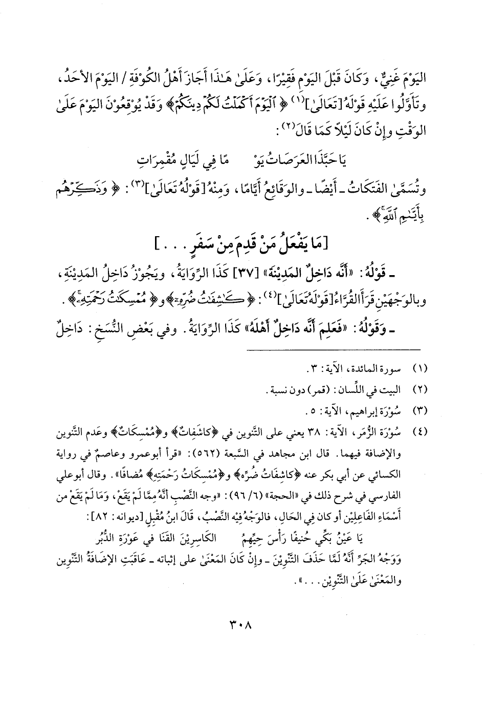 (¬4) سُوْرَة الزُّمَر، الآية: 38 يعني على التَّنوين في {كاشَفِاتٌ} و {مُمْسِكَاتٌ} وعَدم التَّنوين والإضافة فيهما. قال ابن مجاهد في السَّبعة (562): "قرأ أبو عمرو وعاصمٌ في رواية الكسائي عن أبي بكر عنه {كاشِفَاتُ ضُرِّه} و {مُمْسِكَاتُ رَحْمَتِهِ} مُضافًا". وقال أبو علي الفارسيّ في شرح ذلك في "الحجة" (6/ 96): "وجه النَّصْبِ أنَّهُ مِمَّا لَمْ يَقَعْ، وَمَا لَمْ يَقَعْ من أَسْمَاءِ الفَاعِلِين أو كان في الحَالِ، فالوَجْهُ فِيه النَّصْبُ، قَال ابنُ مُقْبِلٍ [ديوانه: 82]: