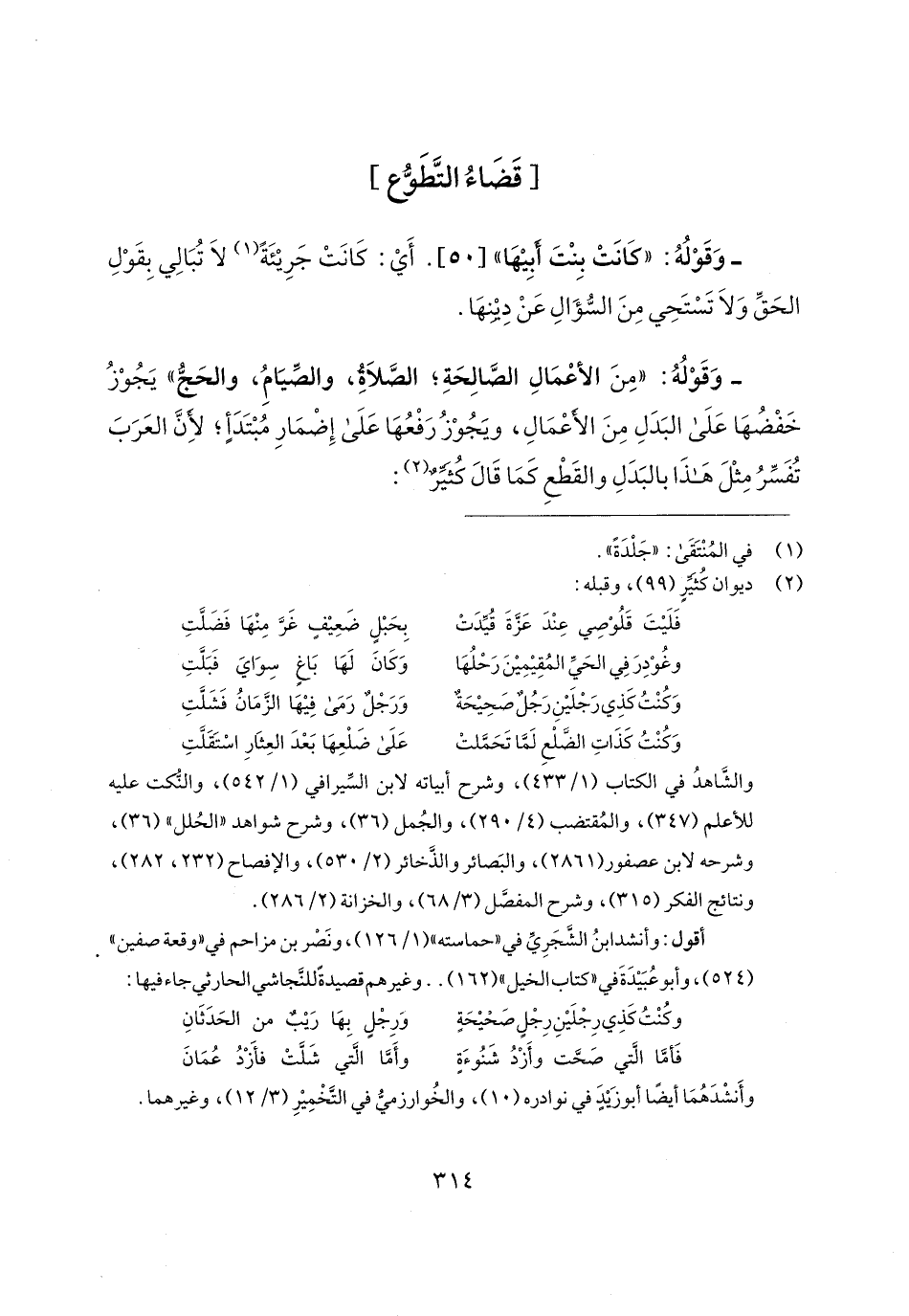- وَقَوْلُهُ: "مِنَ الأعْمَالِ الصَّالِحَةِ؛ الصَّلَاةُ، والصِّيَامُ، والحَجُّ" يَجُوْزُ خَفْضُهَا عَلَى البَدَلِ مِنَ الأعْمَالِ، ويَجُوْزُ رَفْعُهَا عَلَى إِضْمَارِ مُبْتَدَأٍ؛ لأنَّ العَرَبَ تُفَسِّرُ مِثْلَ هَذَا بالبَدَلِ والقَطْعِ كَمَا قَال كُثيِّرٌ (¬2):
