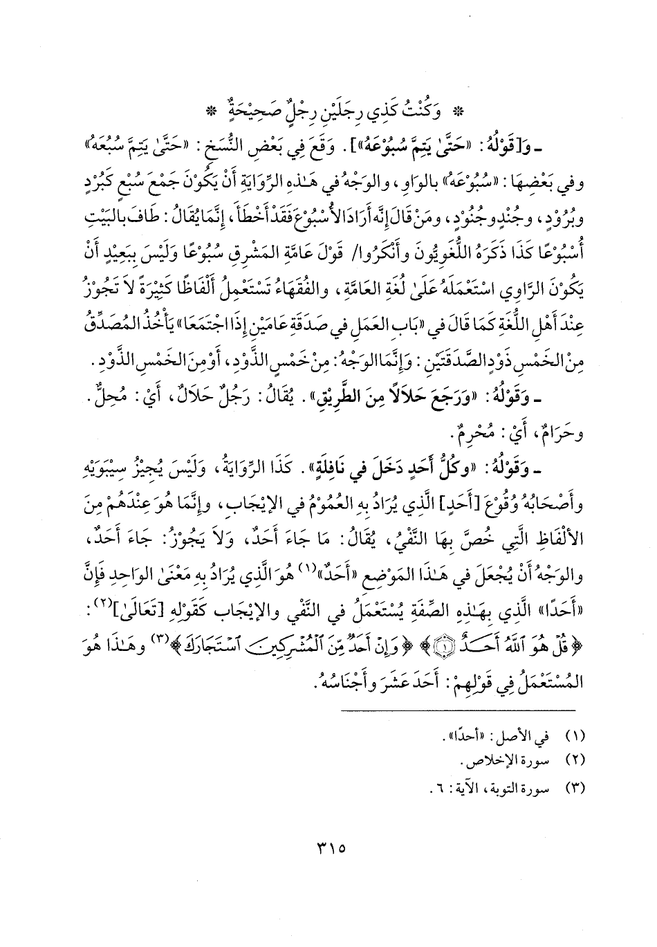 - وَقَوْلُهُ: "وكُلُ أحَدٍ دَخَلَ في نَافِلَةٍ". كَذَا الرِّوَايَةُ، وَلَيسَ يُجِيزُ سِيبَوَيهِ وأَصْحَابُهُ وُقُوْعَ [أَحَدٍ] الَّذِي يُرَادُ بِهِ العُمُوْمُ في الإيجَابِ، وإِنَّمَا هُوَ عِنْدَهُمْ مِنَ الألْفَاظِ الَّتِي خُصَّ بِهَا النَّفْيُ، يُقَالُ: مَا جَاءَ أَحَد، وَلَا يَجُوْزُ: جَاءَ أَحَدٌ، والوَجْهُ أَنْ يُجْعَلَ في هَذَا المَوْضِعِ "أَحَدٌ" (¬1) هُوَ الَّذِي يُرَادُ بِهِ مَعْنَى الوَاحِدِ فَإِنَّ "أَحَدًا" الَّذِي بِهَذِهِ الصِّفَةِ يُسْتَعْمَلُ في النَّفْي والإيجَاب كَقَوْلهِ [تَعَالى] (¬2): {قُلْ هُوَ اللَّهُ أَحَدٌ (1)} {وَإِنْ أَحَدٌ مِنَ الْمُشْرِكِينَ اسْتَجَارَكَ} (¬3) وهَذَا هُوَ المُسْتَعْمَلُ في قَوْلهِمْ: أَحَدَ عَشَرَ وأَجْنَاسُهُ.