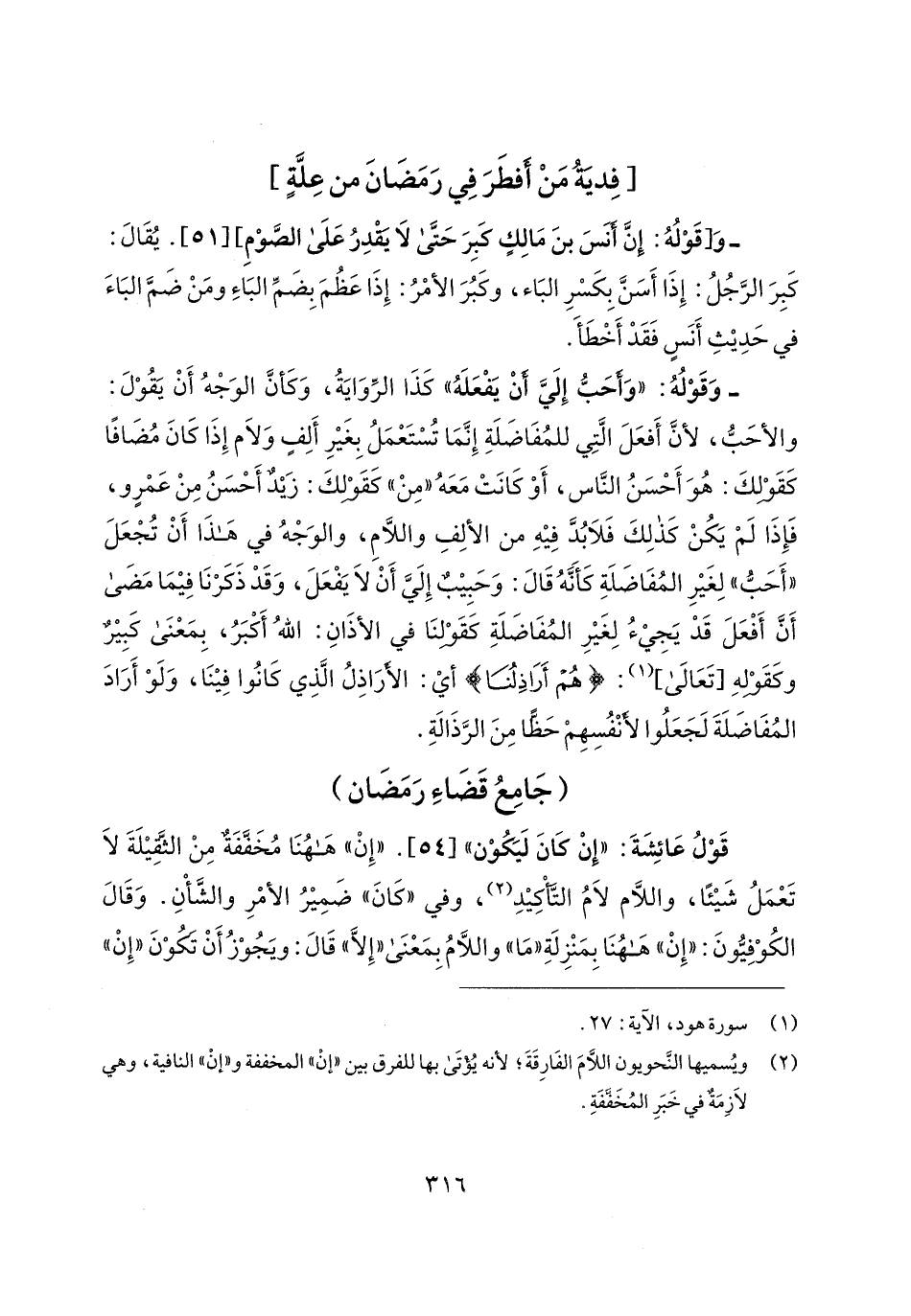 - وَ [قَوْلُهُ: إنَّ أَنَسَ بنَ مَالِكٍ كَبِرَ حَتَّى لَا يَقْدِرُ عَلَى الصَّوْمِ] [51]. يُقَال: كَبِرَ الرَّجُلُ. إِذَا أَسَنَّ بِكَسْرِ البَاء، وكَبُرَ الأمْرُ: إِذَا عَظُمَ بِضَمِّ البَاءِ ومَنْ ضَمَّ البَاءَ في حَدِيثِ أَنَسٍ فَقَدْ أَخْطَأَ.