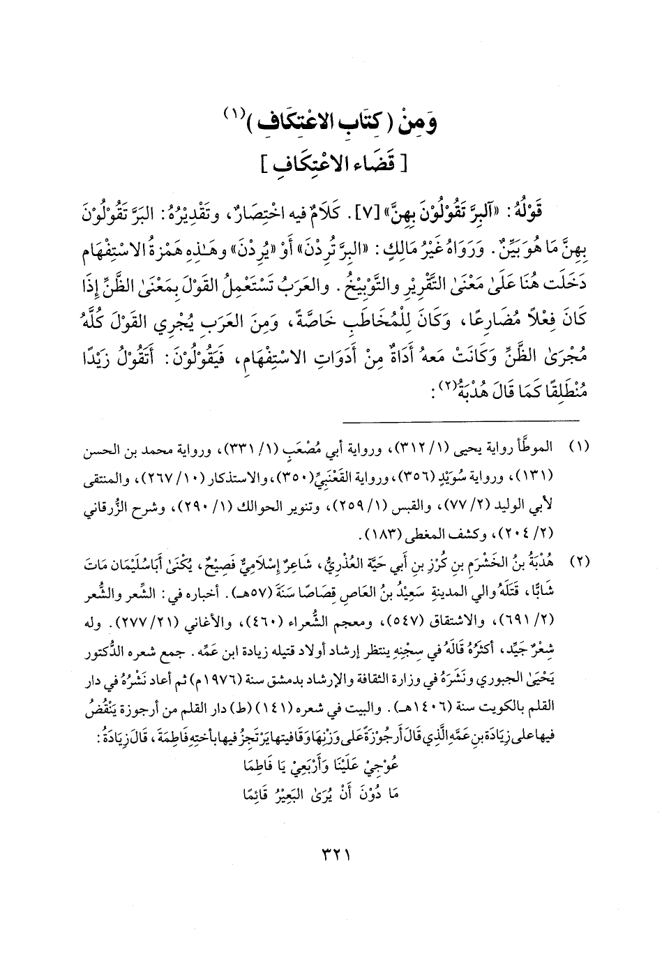 قَوْلُهُ: "آلبِرَّ تَقُوْلُوْنَ بِهِنَّ" [7]. كَلَامٌ فيه اخْتِصَارٌ، وتَقْدِيرُهُ: البَرَّ تَقُوْلُوْنَ بِهِنَّ مَا هُوَ بَيِّنٌ. وَرَوَاهُ غَيرُ مَالِكٍ: "البِرَّ تُرِدْنَ" أَوْ "يُرِدْنَ" وهَذِه هَمْزةُ الاسْتِفْهَام دَخَلَت هُنَا عَلَى مَعْنَى التَّقْرِيرِ والتَّوْبِيخُ. والعَرَبُ تَسْتَعْمِلُ القَوْلَ بِمَعْنَى الظَّنِّ إِذَا كَانَ فِعْلًا مُضَارِعًا، وَكَانَ لِلْمُخَاطَبِ خَاصَّة، وَمِنَ العَرَبِ يُجْرِي القَوْلَ كُلَّهُ مُجْرَى الظَّنِّ وَكَانَتْ مَعهُ أَدَاةٌ مِنْ أَدَوَاتِ الاسْتِفْهَامِ، فَيَقُوْلُوْنَ: أَتَقُوْلُ زَيدًا مُنْطَلِقًا كَمَا قَال هُدْبَةُ (¬2):