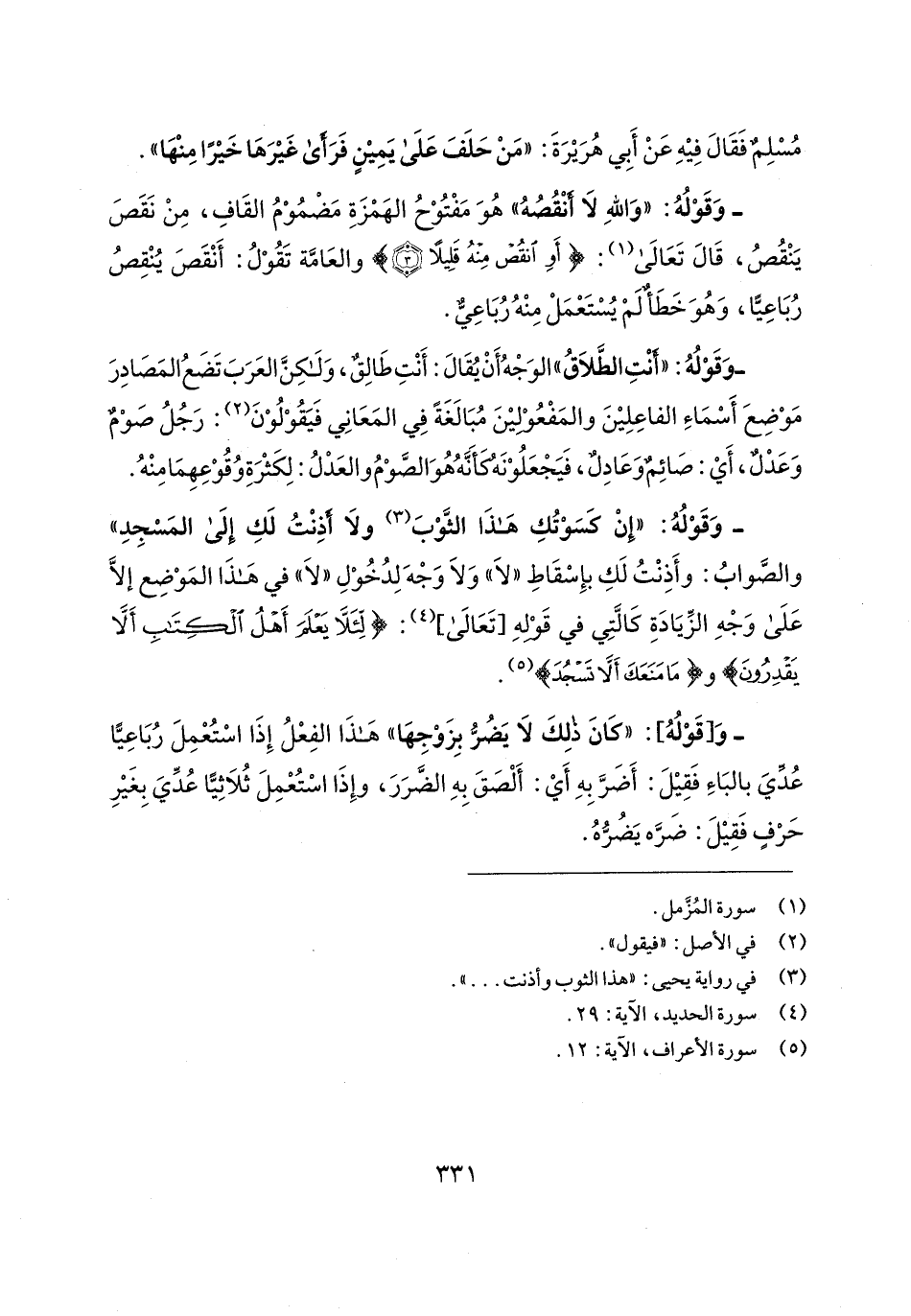 - وَقَوْلُهُ: "وَاللهِ لَا أنْقُصُهُ" هُوَ مَفْتُوْحُ الهَمْزَةِ مَضْمُوْمُ القَافِ، مِنْ نَقَصَ ينقصُ، قال تعالى (¬1): {أَو انْقُصْ مِنْهُ قَلِيلًا} والعَامَّة تَقُوْلُ: أَنْقَصَ يُنْقِصُ رُبَاعِيًّا، وَهُوَ خَطَأٌ لَمْ يُسْتَعْمَلْ مِنْهُ رُبَاعِيٌّ.