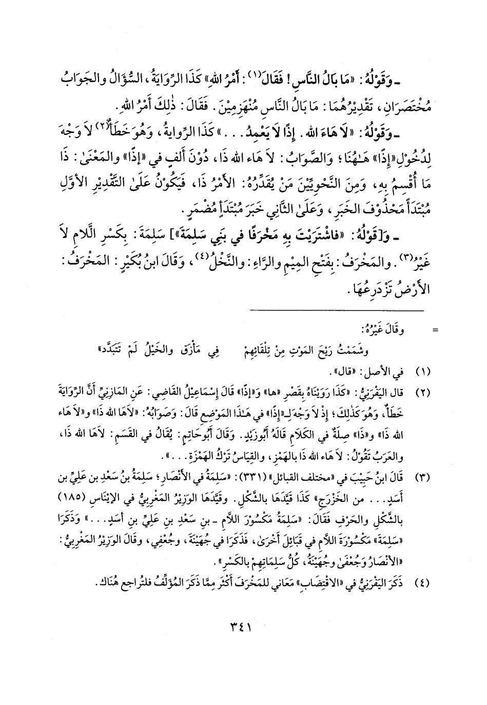 (¬2) قال اليَفْرَنيُّ: "كَذَا رَوَينَاهُ بِقَصْرِ "ها" وَ"إذا" قَال إِسْمَاعِيلُ القَاضِي: عَنِ المَازِنِيِّ أنَّ الروَايَةَ خَطَأٌ، وَهُوَ كَذلِكَ؛ إِذْ لا وَجْهَ لِـ"إِذا" في هَذَا المَوْضِعِ قَال: وَصَوَابُهُ: "لَاهَا الله ذَا" و"لا هَاء الله ذَا" و"ذَا" صِلَةٌ في الكَلَامِ قَالهُ أَبُو زَيدِ. وَقَال أَبو حَاتِم: يُقَالُ في القَسَمِ: لَاهَا الله ذَا، والعَرَبُ تَقُوْلُ: لا هَاء الله ذَا بالهَمْزِ، والقِيَاسُ تَرْكُ الهَمْزَةِ ... ".