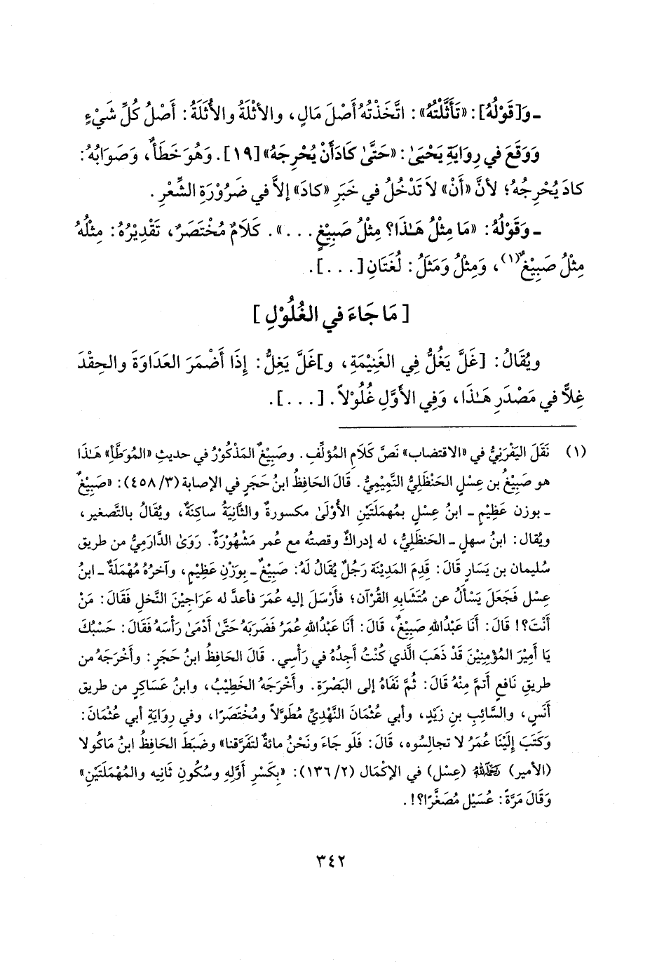 (¬1) نَقَلَ اليَفْرَنِيُّ في "الاقتضاب" نَصَّ كَلَامِ المُؤلّفِ. وصَبِيغ المَذْكُوْرُ في حديثِ "المُوَطَّأ" هَذَا هو صَبِيغ بن عِسْل الحَنْظَلِي التَّمِيمِي. قَال الحَافِظُ ابنُ حَجَرِ في الإصابة (3/ 458): "صَبِيغٌ -بوزن عَظِيمِ- ابنُ عِسْلٍ بمُهمَلَتيَنِ الأوْلَى مكسورةٌ والثانِيَةُ ساكِنةٌ، ويُقَالُ بالتصغير، ويُقال: ابنُ سهلٍ -الحَنظَلِيّ، له إدراكٌ وقصتُه مع عُمر مَشْهُوْرَةٌ. رَوَى الدَّارَمِيُّ من طريق سُليمان بن يَسَارٍ قَال: قِدِمَ المَدِينة رَجُلٌ يُقَالُ لَهُ: صَبِيغٌ -بِوَزْنِ عَظِيمٍ، وآخرُهُ مُهْمَلَةٌ- ابنُ عِسْل فَجَعَلَ يَسْألُ عن مُتَشَابهِ القُرْآن؛ فَأرْسَلَ إليه عُمَرَ فأعدَّ له عَرَاجِينَ النَّخلِ فَقَال: مَنْ أَنْتَ؟ ! قَال: أَنَا عَبْدُ اللهِ صَبِيغٌ، قَال: أَنَا عَبْدُ اللهِ عُمَرُ فَضَرَبَهُ حَتَّى أَدْمَى رَأْسَهُ فَقَال: حَسْبُكَ يَا أَمِيرَ المُؤمِنِينَ قَدْ ذَهَبَ الَّذي كُنْتُ أَجِدُهُ في رَأْسِي. قَال الحَافِظُ ابنُ حَجَرٍ: وأَخْرَجَهُ من طريقِ نَافعِ أَتمَّ مِنْهُ قَال: ثُمَّ نَفَاهُ إلى البَصْرَةِ. وأَخْرَجَهُ الخَطِيبُ، وابنُ عَسَاكِرِ من طريق أَنَسٍ، والسَّائِبِ بنِ زَيدِ، وأبي عُثْمَانَ النَّهْدِيّ مُطَوَّلًا ومُخْتَصَرَا، وفي رِوَايَةِ أبي عُثْمَانَ: وَكَتَبَ إِلَينَا عُمَرُ لا تجالِسُوه، قَال: فَلَو جَاءَ ونَحْنُ مائةٌ لتفَرَّقنا" وضَبَطَ الحَافِظُ ابنُ مَاكُولا (الأمير) رحمه الله (عِسْل) في الإكْمَال (2/ 136): "بِكَسْرِ أَوَّلِهِ وسُكُونِ ثَانِيه والمُهْمَلَتيَنِ" وَقَال مَرَّةً: عُسَيل مُصَغَّرًا؟ ! .