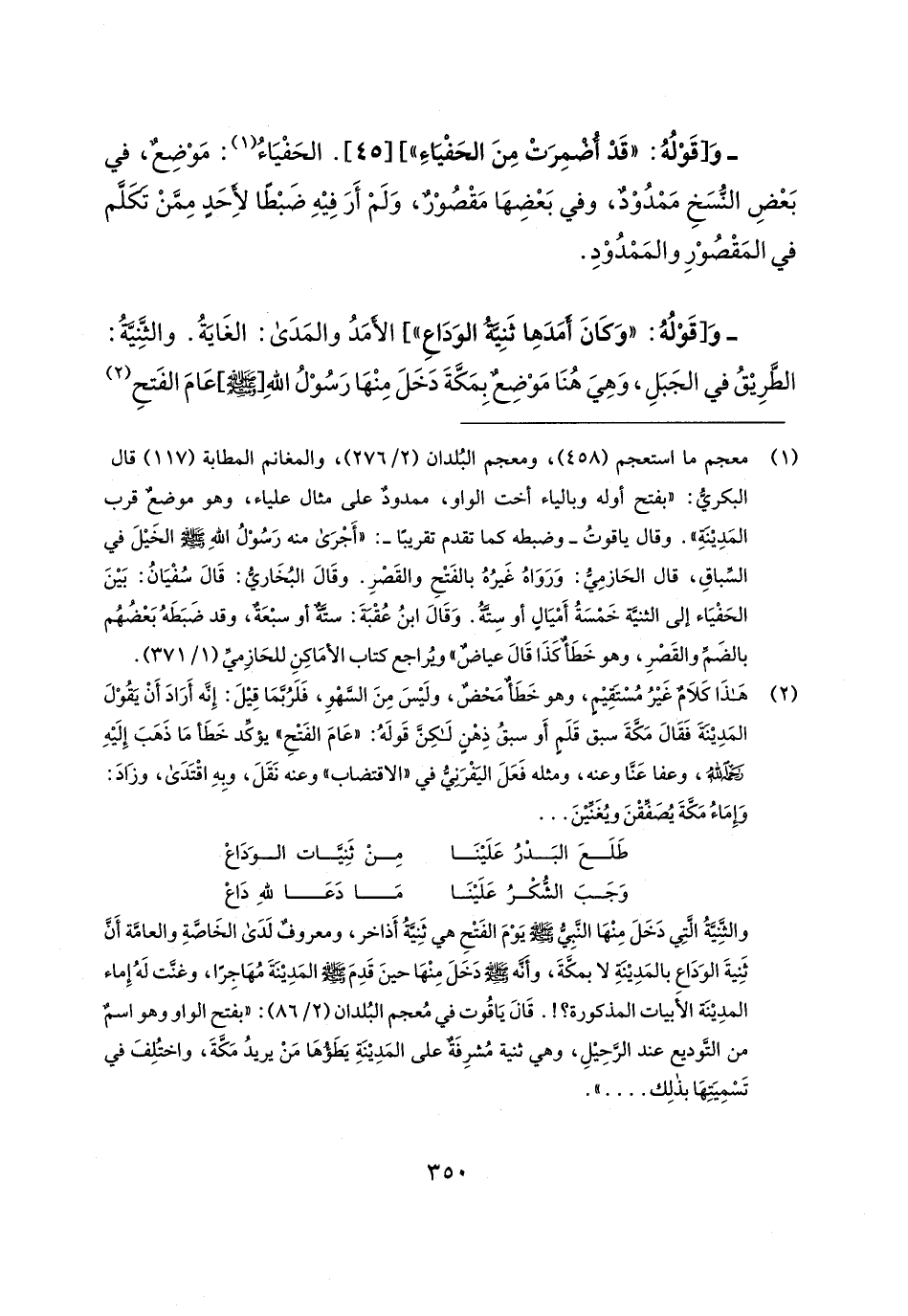 (¬1) معجم ما استعجم (458)، ومعجم البُلدان (2/ 276)، والمغانم المطابة (117) قال البكريُّ: "بفتح أوله وبالياء أحَبّ الواو، ممدود على مثال علياء، وهو موضعٌ قرب المَدِينَةِ". وقال ياقوتُ -وضبطه كما تقدم تقريبًا-: "أَجْرَى منه رَسُوْلُ اللهِ - صلى الله عليه وسلم - الخَيلَ في السِّباقِ، قال الحَازمِيُّ: وَرَوَاهُ غَيرُهُ بالفَتح والقَصْرِ. وقَال البُخَاريُّ: قَال سُفْيَانُ: بَينَ الحَفْيَاء إلى الثنيَّة خَمْسَةُ أَمْيَالِ أو سِتَّةُ. وَقَال ابنُ عُقْبَةَ: ستَّةٌ أو سبْعَةٌ، وقد ضَبَطَهُ بَعْضُهُم بالضَمِّ والقَصْرِ، وهو خَطَأٌ كَذَا قَال عياضٌ" ويُراجع كتاب الأمَاكِنِ للحَازِميِّ (1/ 371).