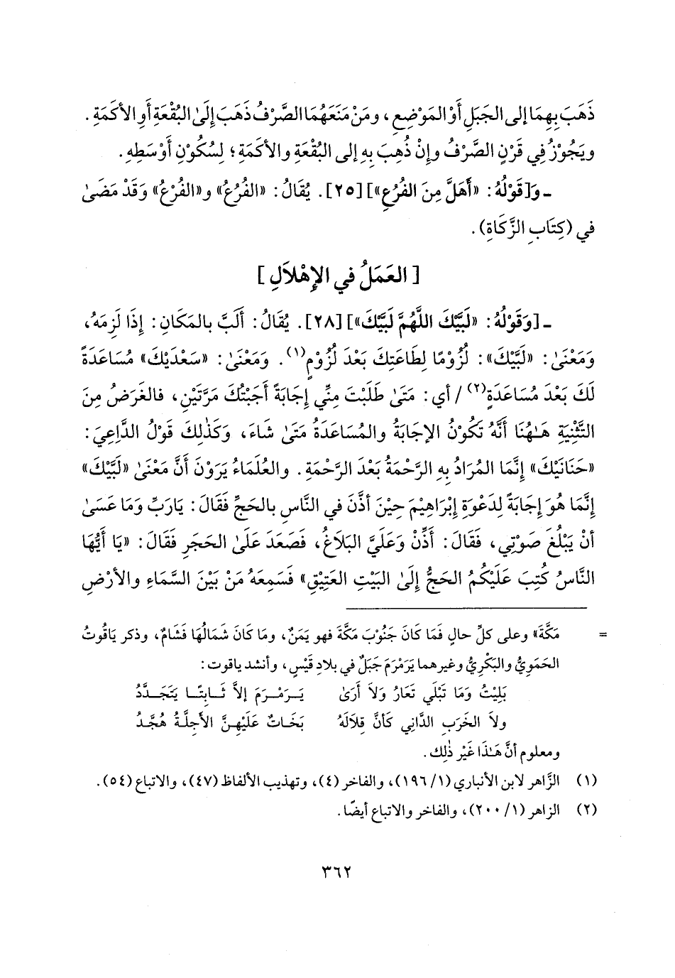 -[وَقَوْلُهُ: "لَبيَّكَ اللَّهُمَّ لَبّيكَ"] [28]. يُقَالُ: أَلبَّ بالمَكَانِ: إِذَا لَزِمَهُ، وَمَعْنَى: "لَبَّيكَ": لزوْمًا لِطَاعَتِكَ بَعْدَ لزوْمٍ (¬1). وَمَعْنَى: "سَعْدَيكَ، مُسَاعَدَةً لَكَ بَعْدَ مُسَاعَدَةٍ (¬2) أي: مَتَى طَلَبْتَ مِنِّي إِجَابَةً أَجَبْتك مَرَّتَينِ، فالغَرَضُ مِنَ التَّثْنِيَةِ ها هنَا أَنّهُ يكوْنُ الإجَابَةُ والمُسَاعدَةُ مَتَى شَاءَ، وَكَذلِكَ قَوْلُ الدَّاعِيَ: "حَنَانَيكَ" إِنَّمَا المُرَادُ بِهِ الرَّحْمَةُ بَعْدَ الرَّحْمَةِ. والعُلَمَاءُ يَرَوْنَ أَنَّ مَعْنَى "لَبَّيكَ" إِنَّمَا هُوَ إِجَابَةً لِدَعْوَةِ إِبْرَاهِيمَ حِينَ أذَّنَ في النَّاسِ بالحَجِّ فَقَال: يَا رَبِّ وَمَا عَسَى أنْ يَبْلُغَ صَوْتي، فَقَال: أَذِّنْ وَعَلَيَّ البَلاغُ، فَصَعَدَ عَلَى الحَجَرِ فَقَال: "يَا أَيُّهَا النَّاسُ كُتِبَ عَلَيكُمُ الحَجُّ إِلَى البَيتِ العَتِيقِ" فَسَمِعَهُ مَنْ بَينَ السَّمَاءِ والأرْضِ
