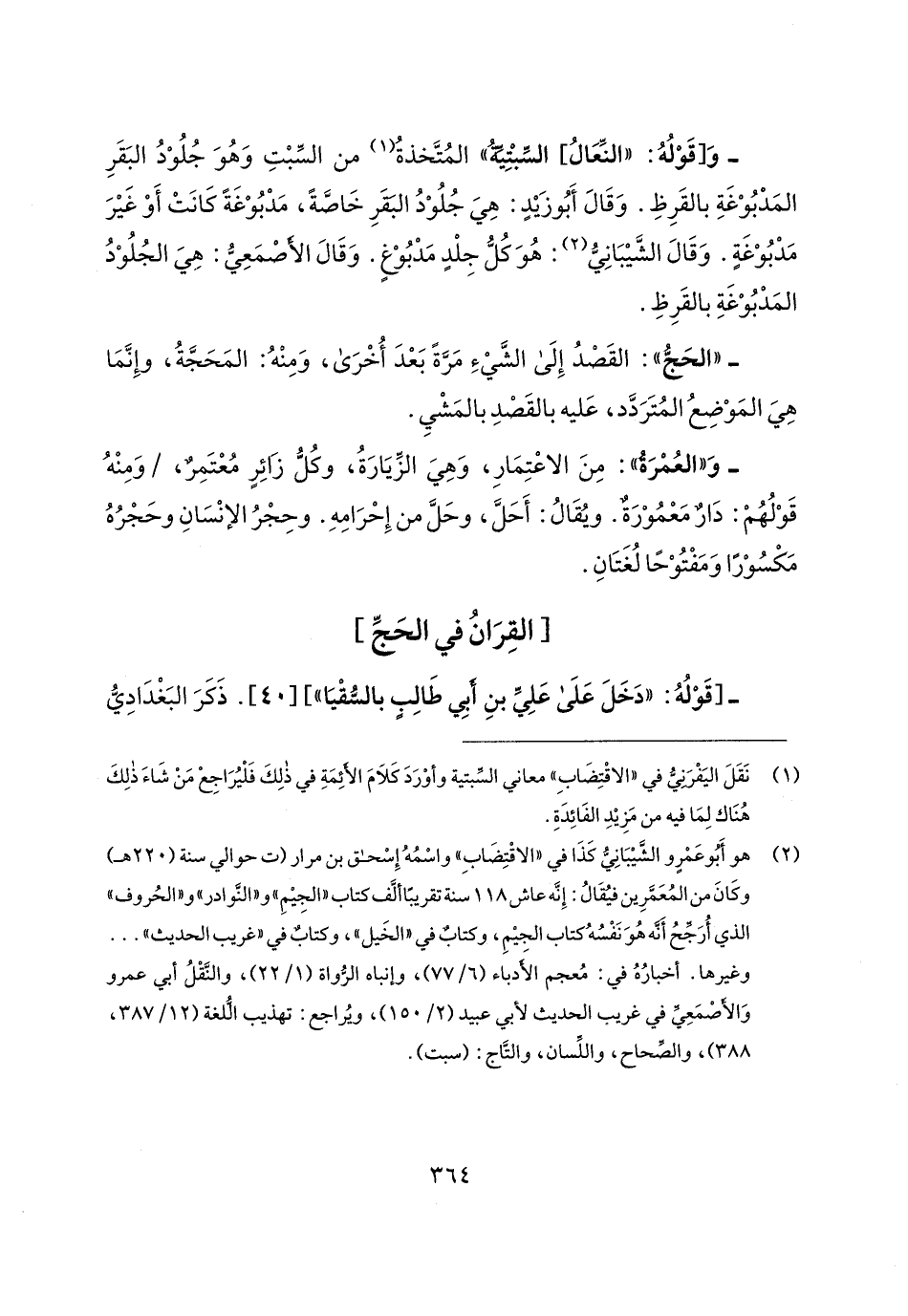 (¬2) هو أَبُو عَمْرٍو الشَّيبَانِي كَذَا في "الاقْتِضَابِ" واسْمُهُ إِسْحق بن مرار (ت حوالي سنة (220 هـ) وكَانَ من المُعَمَّرِين فيُقَالُ: إِنَّه عاش 118 سنة تقريبًا ألَّف كتاب "الجِيمِ" و "النوادر" و"الحُروف" الذي أُرَجِّحُ أنه هُوَ نَفْسُهُ كتاب الجيمِ، وكتابٌ في "الخَيل", وكتابٌ في "غريب الحديث" ... وغيرها. أخبارُهُ في: مُعجم الأدباء (6/ 77)، وإنباه الرُّواة (1/ 22)، والنَّقْلُ أبي عمرو وَالأصْمَعِي في غريب الحديث لأبي عبيد (2/ 150)، ويُراجع: تهذيب الُّلغة (12/ 387، 388)، والصحاح، واللِّسان، والتَّاج: (سبت).
