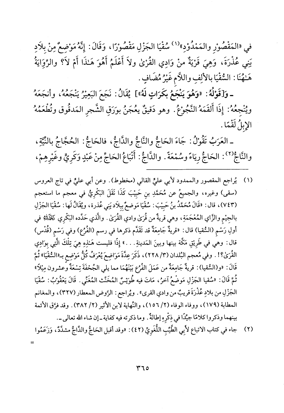 (¬1) يُراجع المقصور والممدود لأبي علي القالي (مخطوط). وعن أبي علي في تاج العروس (سقى) وغيره، والجميعُ عن مُحَمَّدِ بنِ حَبِيبَ كَذَا نَقَلَ البكْرِيُّ في معجم ما استعجم (743)، قال: "قَال مُحَمَّدُ بنُ حَبِيب: سُقْيَا مَوضعٌ بِبِلاد بَني عُذرة، ويُقَالُ لَها: سُقْيَا الجَزْلِ بالجِيمِ والزَّاي المُعْجَمَةِ، وهي قريةٌ من قُرَى وادي القُرَى. والَّذي حَدَّده البَكْرِي رحمه الله في أولِ رَسْمِ (السُّقيا) قال: "قريةٌ جَامِعَةٌ قد تَقَدَّم ذكرها في رسم (الفُرُع) وفي رَسْمِ (قُدْس) قال: وهي في طَرِيقِ مَكَّة بينها وبينَ المَدينةِ ... " إِذَا فليست هَذه هِيَ تِلْكَ الَّتِي بِوَادِي القُرَى؟ ! . وفي مُعجم البُلدان (3/ 228)، ذَكَرَ عِدَّةَ مَوَاضِعَ يُعْرَفُ كُلُّ مَوْضِعٍ بـ "السُّقْيَا" ثمَّ قَال: "و (السُّقيا): قريةٌ جَامِعَةٌ من عَمَلَ الفُرُع بَينَهُمَا مما يلي الجُحْفَةَ تِسعَةٌ وعشرون مِيلًا" ثُمَّ قَال: "سُقيا الجَزْلِ مَوضْعُ آخرُ، مَاتَ فيه طُوَيسٌ المُخَنَّث المُغَنِّي. قَال يَعْقُوبُ سُقْيَا الجَزلِ من بلادِ عُذْرَةَ قريبٌ من وادي القرى". ويُراجع: الرَّوض المعطار (327)، والمغانم المطابة (179)، ووفاء الوفاء (2/ 156)، والنّهاية لابن الأثير (2/ 382). وقد فرَّق الأئمة بينهما وذكروا كلامًا جيِّدًا في ذِكرِه إطالةٌ. وما ذكرته فيه كفاية -إن شاء الله تعالى-.