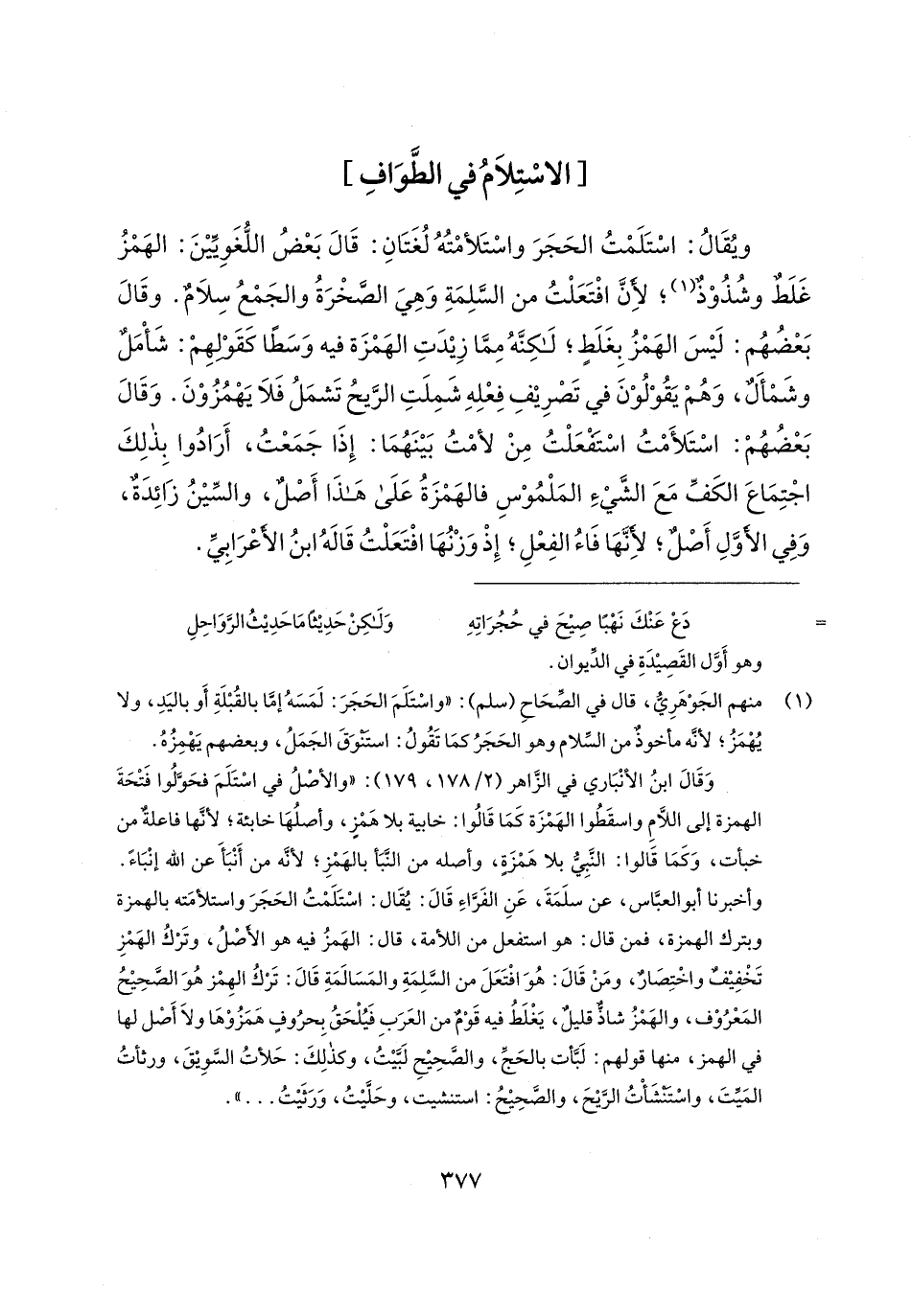 (¬1) منهم الجَوْهَرِيُّ، قال في الصِّحَاحِ (سلم): "واسْتَلَمَ الحَجَرَ: لَمَسَهُ إمَّا بالقُبْلَةِ أَو باليَدِ، ولا يُهْمَزُ؛ لأنَّه مأخوذٌ من السِّلام وهو الحَجَرُ كمَا تَقُولُ: استنوَقَ الجَمَلُ، وبعضهم يَهْمِزهُ.