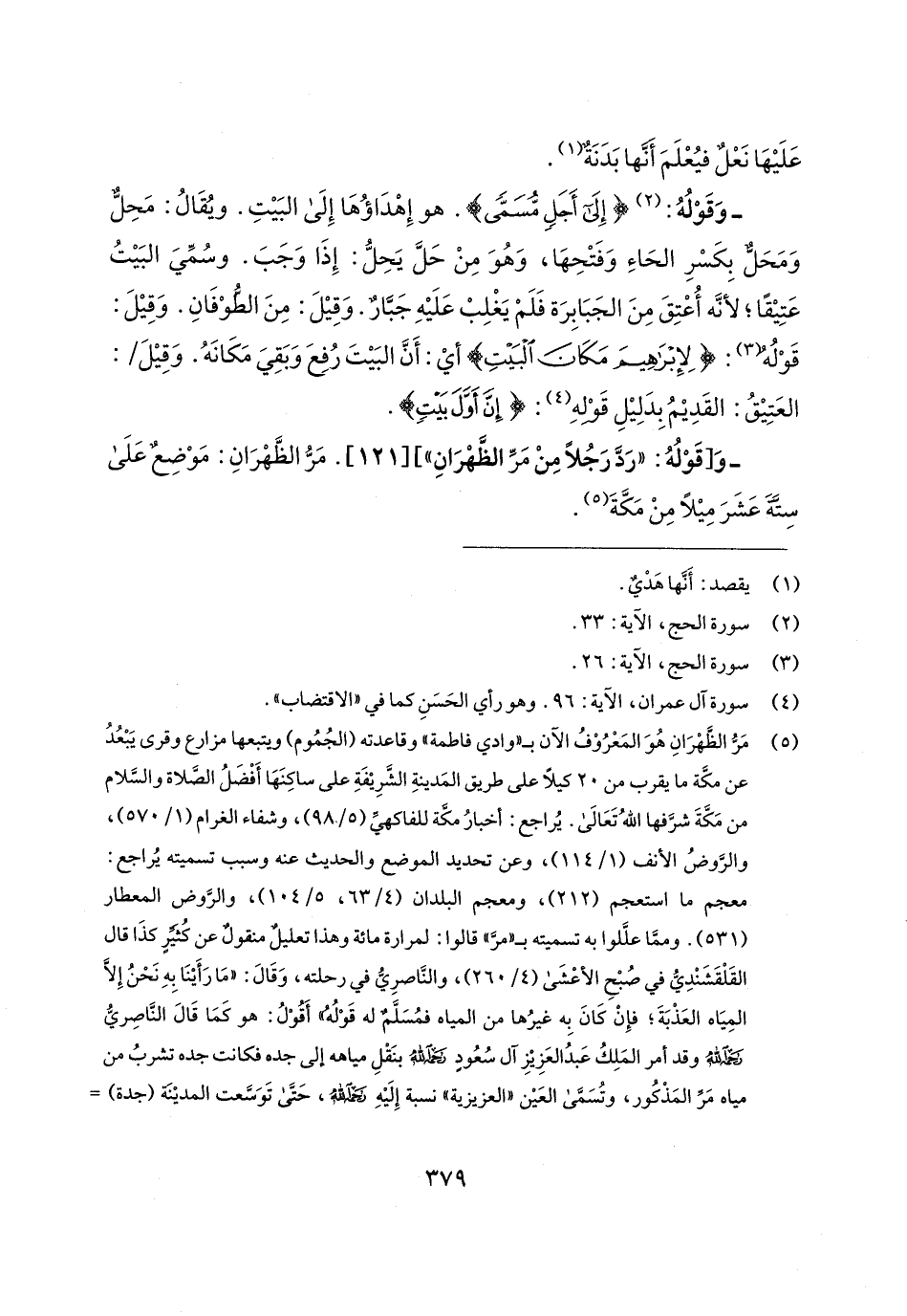 (¬5) مَرُّ الظَّهْرَانِ هُوَ المَعْرُوْف الآن بـ "وادي فاطمة" وقاعدته (الجُمُوم) ويتبعها مزارع وقرى يَبْعُدُ عن مكَّة ما يقرب من 20 كيلًا على طريق المَدينةِ الشَّرِيفَةِ على ساكِنَهَا أَفْضَلُ الصَّلاة والسَّلام من مَكَّةَ شرَّفها اللهُ تَعَالى. يُراجع: أخبارُ مكة للفاكهيِّ (5/ 981)، وشفاء الغرام (1/ 570)، والرَّوضُ الأنف (1/ 114)، وعن تحديد الموضع والحديث عنه وسبب تسميته يُراجع: معجم ما استعجم (212)، ومعجم البلدان (4/ 63، 5/ 104)، والرَّوض المعطار (531). ومما علَّلوا به تسميته بـ "مرَّ" قالوا: لمرارة مائة وهذا تعليلٌ منقولٌ عن كُثيرٍ كذَا قال القَلْقَشَنْدِيُّ في صُبْحِ الأعْشى (4/ 260)، والنَّاصرِيُّ في رحلته، وَقَال: "مَا رَأَينَا بِهِ نَحْنُ إلا المِيَاه العَذْبَةَ؛ فإِنْ كَانَ بِه غيرُها من المياه فمُسَلَّم له قَوْلُه" أَقُوْلُ: هو كمَا قَال النَّاصِريُّ رحمه اللهُ وقد أمر المَلِكُ عَبدُ العَزِيزِ آل سُعُودِ رحمه اللهُ بنَقْلِ مياهه إلى جده فكانت جده تشربُ من مياه مَرِّ المَذْكُور، وتُسَمَّى العَين "العزيزية" نسبة إِلَيهِ رحمه الله، حَتَّى تَوَسَّعت المدينة (جدة) =