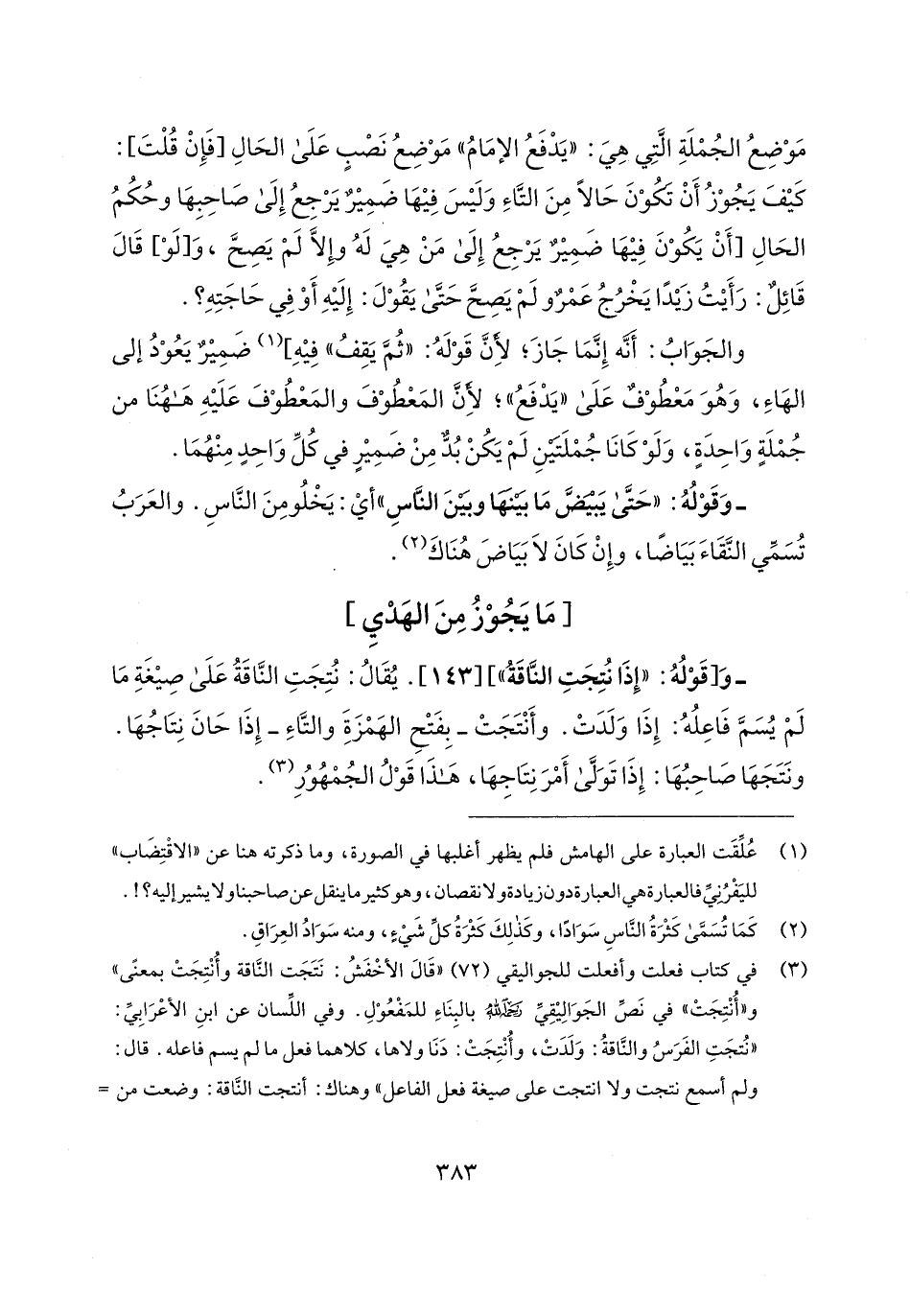 - وَ [قَوْلُهُ: "إِذَا نُتِجَتِ النَّاقَةُ"] [143]. يُقَالُ: نُتِجَتِ النَّاقَةُ عَلَى صِيغَةِ مَا لَمْ يُسَمَّ فَاعِلُهُ: إِذَا وَلَدَتْ. وأَنْتَجَتْ -بِفَتْحِ الهَمْزَةَ والتَّاءِ- إِذَا حَانَ نِتَاجُهَا. ونَتَجَهَا صَاحِبُهَا: إِذَا تَوَلَّى أَمْرَ نِتَاجِهَا، هَذَا قَوْلُ الجُمْهُوُرِ (¬3).