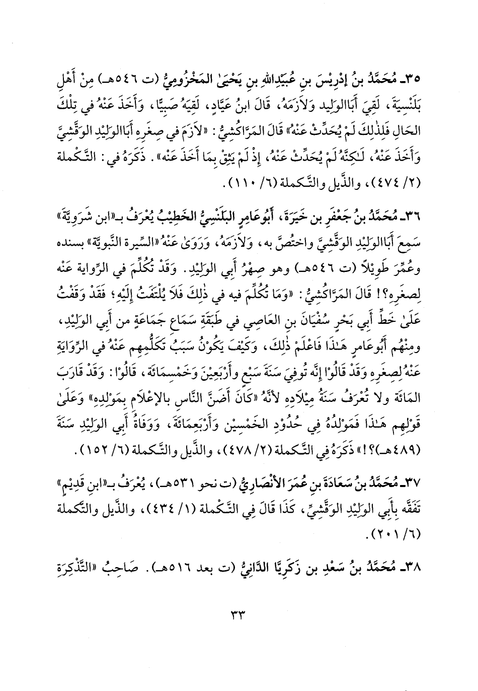 35 - مُحَمَّدُ بنُ إدْرِيسَ بنِ عُبدِ اللهِ بنِ يَحْيى المَخزُوميُّ (ت 546) مِنْ أَهْلِ بَلَنْسِيَةَ، لَقِيَ أَبَا الوَليد وَلازَمَهُ، قَال ابنُ عَيَّادٍ، لَقِيَهُ صَبِيًّا، وَأَخَذَ عَنهُ في تِلْكَ الحَالِ فلِذلِكَ لَمْ يُحَدِّثْ عَنْهم" قَال المَرَّاكُشِيُّ: "لازَمَ في صِغَرِهِ أَبَا الوَليْدِ الوَقِّشِيَّ وَأَخَذَ عَنْهُ، لَكِنَّهُ لَمْ يُحَدِّثْ عَنْهُ، إِذْ لَمْ يَثِقْ بِمَا أَخَذَ عَنْه". ذَكَرَهُ في: التَّكْملة (2/ 474)، والذَّيل والتَّكملة (6/ 110).