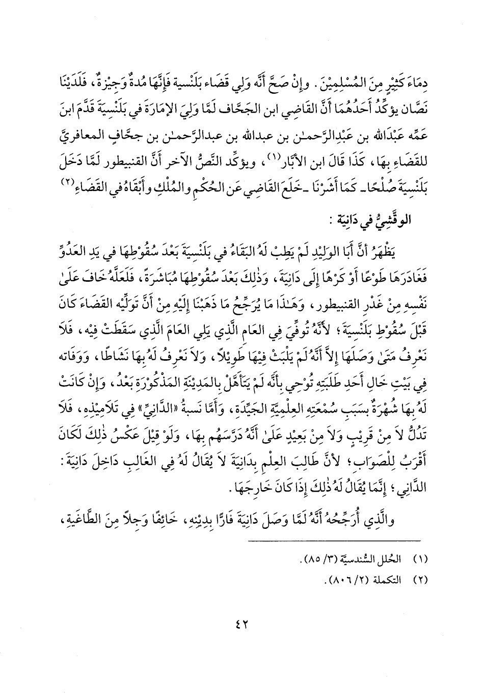 دِمَاءَ كَثيْرٍ مِنَ المُسْلِمِيْنَ. وإِنْ صَحَّ أَنَّه وَلِي قَضاء بَلَنْسية فَإِنَّهَا مُدةٌ وَجِيْزةٌ، فَلَدَيْنَا نَصَّان يؤكِّدُ أَحَدُهُمَا أَنَّ القَاضِي ابن الجَحَّاف لَمَّا وَلِيَ الإمَارَةَ في بَلَنْسِيَةَ قَدَّمَ ابنَ عَمِّه عَبْدَ الله بن عَبْدِ الرَّحمن بن عبد الله بن عبد الرَّحمن بن جحَّافٍ المعافريَّ للقَضَاءِ بِهَا، كَذَا قَال ابن الأبَّار (¬1)، ويؤكِّد النَّصُّ الآخر أَنَّ القنبيطور لَمَّا دَخَلَ بَلَنْسِيَةَ صُلْحًا -كَمَا أَشَرْنَا- خَلَعَ القَاضِي عَن الحُكْمِ والمُلْكِ وأَبْقَاهُ في القَضَاءِ (¬2).