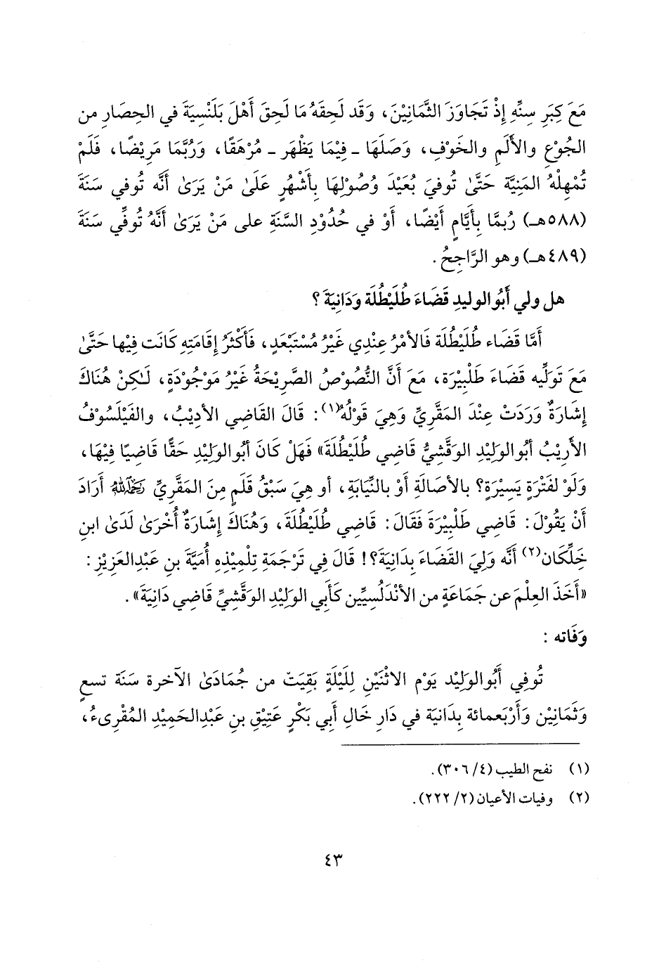 أَمَّا قَضَاء طُلَيْطُلَة فَالأمْرُ عِنْدِي غَيْرُ مُسْتبعَدٍ، فَأكثَرُ إِقَامَتِهِ كَانَت فِيْها حَتَّى مَعَ تَوَلِّيه قَضَاءَ طَلْبِيْرَة، مَعَ أَنَّ النُّصُوْصُ الصَّرِيْحَةُ غَيْرُ مَوْجُوْدَةٍ، لكِنْ هُنَاكَ إِشَارَةٌ وَرَدَتْ عِنْدَ المَقَّرِيِّ وَهِيَ قَوْلُه (¬1): قَال القَاضِي الأدِيْبُ، والفَيْلَسُوْفُ الأَرِيْبُ أبُو الوَليْدِ الوَقَّشِيُّ قَاضِي طُلَيطُلَةَ" فَهَلْ كَانَ أبُو الوَليْدِ حَقًّا قَاضِيًا فِيْهَا، وَلَوْ لفَتْرَةٍ يَسِيْرَةٍ؟ بالأصَالةِ أَوْ بالنَيَابَةِ، أو هِيَ سَبْقُ قَلَمٍ مِنَ المَقَّرِيِّ رحمه الله أَرَادَ أَنْ يَقُوْلَ: قَاضِي طَلْبِيْرَةَ فَقَال: قَاضِي طُلَيْطُلَةَ، وَهُنَاكَ إِشَارَةٌ أُخْرَى لَدَى ابنِ خَلِّكَان (¬2) أَنَّه وَلِيَ القَضَاءَ بِدَانِيَةَ؟ ! قَال في تَرْجَمَةِ تِلْمِيْذِهِ أُمَيَّةَ بنِ عَبْدِ العَزِيْزِ: "أَخَذَ العِلْمَ عن جَمَاعَة من الأنْدَلُسِيِّين كَأبي الوَليْدِ الوَقَّشِيِّ قَاضِي دَانِيَةَ".