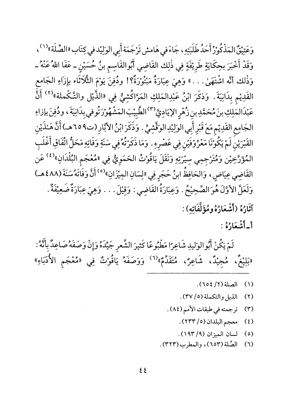 وَعَتِيْق المَذْكُوْرُ أَحَدُ طَلَبَتِهِ، جَاءَ في هَامش تَرْجَمَة أَبِي الوَليْد في كِتَاب "الصِّلَة" (¬1)، وَقَدْ أَخْبَرَ بحِكَايَةٍ طَرِيْفَةٍ في ذلِك القَاضِي أَبُو القَاسِمِ بنُ حُسَيْنٍ -عَفَا اللهُ عَنْهُ- وَذلك أنَّه اشْتَهَى ... " وَهِيَ عِبَارةٌ مَبْتُوْرَةٌ؟ ! ودُفِنَ يَوْمَ الثُّلاثَاء بإِزَاءِ الجَامعِ القَدِيْمِ بِدَانِيَةَ. وَذكَرَ ابْنُ عَبْدِالمَلِكِ المَرَّاكُشِيُّ في "الذَّيْل والتَّكْملة" (¬2) أَنَّ عَبْدَ المَلِكِ بنَ مُحَمَّدِ بنِ زهرٍ الإيَادِيَّ (¬3) الطَّبِيْبَ المَشْهوْرَ تُوفي بِدَانِيَةَ، ودُفِنَ بإزاءِ الجَامِعِ القَدِيْمِ مَعَ قَبْرِ أَبِي الوَليْدِ الوَقَّشِيِّ. وَذَكَرَ ابْنُ الأبارِ (ت 659 هـ) أَنَّ هَذَيْنِ القَبْرَيْنِ لَمْ يَكُوْنَا مَعْرُوْفَيْنِ في عَصْرِهِ. وَمَا ذَكَرْتُهُ في سَنَةِ وَفَاتِهِ مَحَلُّ اتِّفَاقِ أَغْلَبِ المُؤَرِّخِيْن وَمُتَرْجِمي سِيْرَتهِ وَنَقَلَ يَاقُوْتُ الحَمَويُّ في "مُعْجَمِ البُلْدَانِ" (¬4) عَن القَاضِي عِيَاضٍ، وَالحَافِظُ ابنُ حَجَرٍ في "لِسَانِ المِيْزَانِ" (¬5) أَنَّ وَفَاتَهُ سَنَةَ (488 هـ) وَلَعَلَّ الأوَّلَ هُوَ الصَّحِيْحُ. وَعِبَارَةُ القَاضِي: وَقِيْلَ ... وَهِيَ عِبَارَة ضَعِيْفَةٌ.