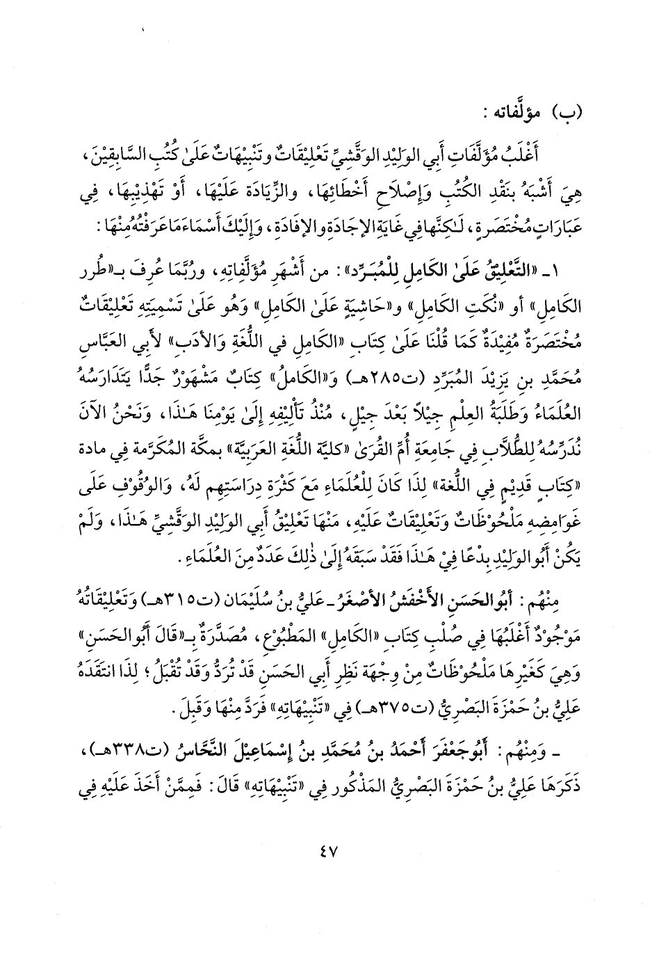 1 - "التَّعْلِيقُ على الكَامِلِ لِلْمُبَرِّد": من أَشْهَرِ مُؤَلَّفِاتِهِ، ورُبَّمَا عُرِفَ بـ "طُرر الكَامِلِ" أو "نكَتِ الكَامِلِ" و"حَاشِيَةٍ عَلَى الكَامِلِ" وَهُو عَلَى تَسْمِيَتِهِ تَعْلِيْقَاتٌ مُخْتَصَرة مُفِيْدَة كَمَا قُلْنَا عَلَى كِتَابِ "الكَامِلِ في اللُّغَةِ وَالأدَبِ" لأبِي العَبَّاسِ مُحَمَّدِ بنِ يَزِيْدَ المُبَرِّدِ (ت 285 هـ) وَ"الكَاملُ" كِتَابٌ مَشْهَوْرٌ جَدًّا يتَدَارَسُهُ العُلَمَاءُ وَطَلَبَةُ العِلْمِ جِيْلًا بَعْدَ جِيْلٍ، مُنْذُ تأْلِيْفِهِ إِلَى يَوْمِنَا هَذَا، وَنَحْنُ الآنَ نُدَرِّسُهُ لِلطُلَّابِ في جَامِعَةِ أُمِّ القُرَى "كليّه اللُّغَةِ العَرَبِيّة" بمكَّة المُكَرَّمة فِي مادة "كِتَابٍ قَدِيْمٍ في اللُّغة" لِذَا كَانَ لِلْعُلَمَاءِ مَعَ كَثرةِ دِرَاسَتِهِم لَهُ، وَالوُقُوْفِ عَلَى غَوَامِضِهِ مَلْحُوْظَاتٌ وَتَعْلِيْقَاتٌ عَلَيْهِ، مَنْهَا تَعْلِيْقُ أَبِي الوَليْدِ الوَقَّشِيِّ هَذَا، وَلَمْ يَكُنْ أَبُو الوَليْدِ بِدْعًا فِي هَذَا فَقَدْ سَبَقَهُ إِلَى ذلِكَ عَدَدٌ مِنَ العُلَمَاءِ.