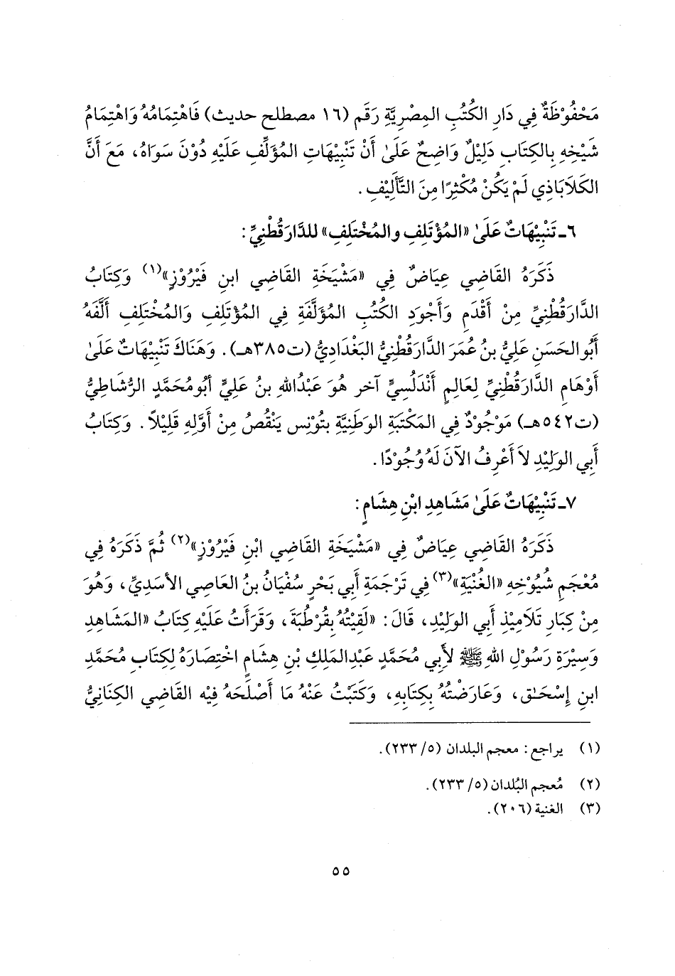 ذَكَرَهُ القَاضِي عِيَاضٌ فِي "مَشْيَخَةِ القَاضِي ابنِ فَيْرُوْزٍ" (¬1) وَكِتَابُ الدَّارَقُطْنِيِّ مِنْ أَقْدَمِ وَأَجْوَدِ الكُتُبِ المُؤَلَّفَةِ فِي المُؤْتَلِفِ وَالمُخْتَلِفِ أَلَّفَهُ أَبُو الحَسَنِ عَلِيُّ بنُ عُمَرَ الدَّارَقُطْنِيُّ البَغْدَادِيُّ (ت 385 هـ). وَهَنَاكَ تَنْبِيْهَاتٌ عَلَى أَوْهَامِ الدَّارَقُطْنِي لِعَالِمٍ أَنْدَلُسِيٍّ آخر هُوَ عَبْدُ اللهِ بنُ عَلِيٍّ أبُو مُحَمَّدٍ الرُّشَاطِيُّ (ت 542 هـ) مَوْجُوْدٌ فِي المَكْتبَةِ الوَطَنِيَّةِ بتُوْنِس يَنْقُصُ مِنْ أَوَّلِهِ قَلِيْلًا. وَكِتَابُ أَبِي الوَليْدِ لَا أَعْرِفُ الآنَ لَهُ وُجُوْدًا.