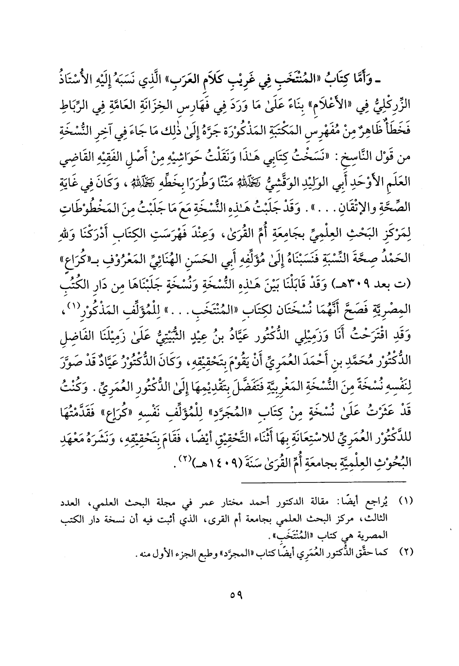 (¬1) يراجع أيضًا: مقالة الدكتور أحمد مختار عمر في مجلة البحث العلمي، العدد الثالث، مركز البحث العلمي بجامعة أم القوى، الذي أثبت فيه أن نسخة دار الكتب المصرية هي كتاب "المُنتَخَبِ".