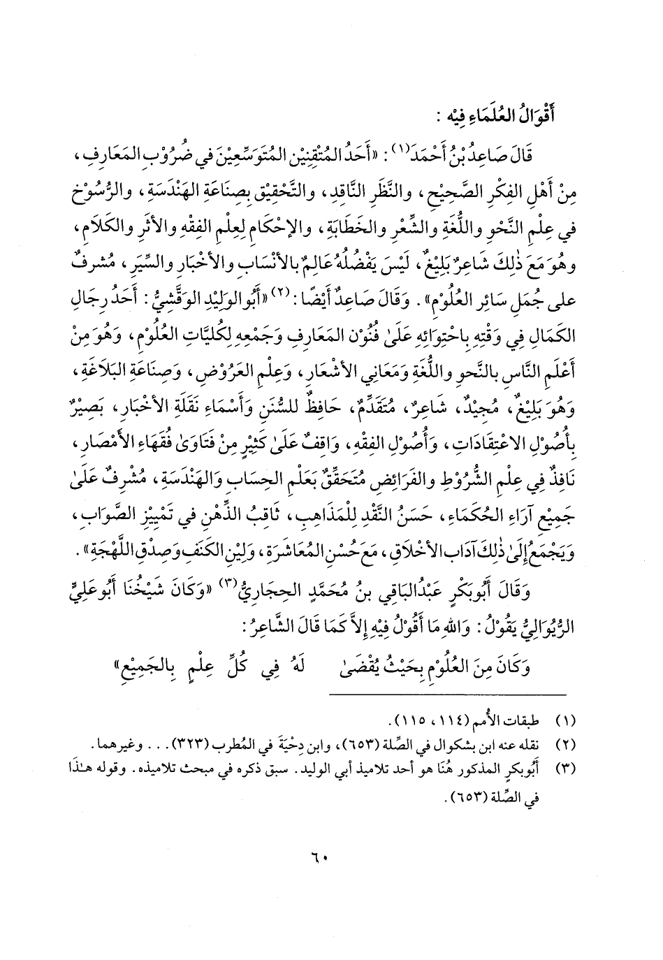 قَال صَاعِدُ بْنُ أَحْمَدَ (¬1): "أَحَدُ المُتْقِنِيْن المُتَوَسِّعِيْنَ في ضُرُوْبِ المَعَارِفِ، مِنْ أَهْلِ الفِكْرِ الصَّحِيْحِ، والنَّظَرِ النَّاقِدِ، والتَّحْقِيْق بِصِنَاعَةِ الهَنْدَسَةِ، والرُّسُوْخ في عِلْمِ النَّحْو واللُّغَةِ والشِّعْرِ والخَطَابَةِ، والإحْكَامِ لِعِلْمِ الفِقْهِ والأثَرِ والكَلامِ، وهُوَ مَعَ ذلِكَ شَاعِرٌ بَلِيْغٌ، لَيْسَ يَفْضُلُهُ عَالِمٌ بالأنْسَابِ والأخْبَارِ والسِّيَرِ، مُشرفٌ على جُمَلِ سَائِر العُلُوْمِ". وَقَال صَاعِدٌ أَيْضًا: (¬2) "أَبُو الوَليْدِ الوَقَّشِيُّ: أَحَدُ رِجَالِ الكَمَالِ فِي وَقْتِهِ بِاحْتِوَائِهِ عَلَى فُنُوْن المَعَارِفِ وَجَمْعِهِ لِكُليَّاتِ العُلُوْمِ، وَهُوَ مِن أَعْلَمِ النَّاسِ بالنَّحو واللُّغَةِ وَمَعَانِي الأشْعَار، وَعِلْمِ العَرُوْضِ، وَصِنَاعَةِ البَلاغَةِ، وَهُوَ بَلِيْغٌ، مُجِيْدٌ، شَاعِرٌ، مُتَقَدِّمٌ، حَافِظٌ للسُّنَنِ وَأَسْمَاءِ نَقَلَةِ الأخْبَارِ, بَصِيْرٌ بِأُصُوْلِ الاعْتِقَادَاتِ، وَأُصُوْلِ الفِقْهِ، وَاقِفٌ عَلَى كَثِيْرٍ مِنْ فَتَاوَى فُقَهَاءِ الأَمْصَارِ، نَافِذٌ فِي عِلْمِ الشُّرُوْطِ والفَرَائِضِ مُتَحَقِّقٌ بَعَلْمِ الحِسَاب وَالهَنْدَسَةِ، مُشْرِفٌ عَلَى جَمِيع آرَاءِ الحُكَمَاءِ، حَسَنُ النَّقْدِ لِلْمَذَاهِبِ، ثَاقِبُ الذِّهْنِ في تَمْيِيْزِ الصَّوَابِ، وَيَجْمَعُ إِلَى ذلِكَ آدَاب الأخْلاقِ، مَعَ حُسْنِ المُعَاشَرَةِ، وَلِيْنِ الكَنَفِ وَصِدْقِ اللَّهْجَةِ".