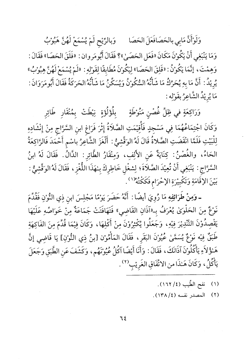 وَمَا يَنْبَغِي أَنْ يَكُوْنَ مَكَانَ "فَعَل الحَصَى"؟ فَقَال أَبُو مَروان: "فَلَقَ الحَصا" فَقَال: وَهِمْتَ، إنَّمَا يَكُوْنُ: "قَلِقَ الحَصَا" لِيَكُوْنَ مُطَابِقًا لِقَوْلهِ: "لَمْ يُسْمَعْ لَهُنَّ هِبُوْبُ" يُرِيْدُ: أَنَّ مَا بِهِ يُحَرِّكُ مَا شَأْنُهُ السُّكُوْنُ وَيُسَكِّنُ مَا شَأْنُهُ الحَرَكَةُ فَقَال أَبُو مَرَوَانَ: مَا يُرِيْدُ الشَّاعِرُ بقَوْله: