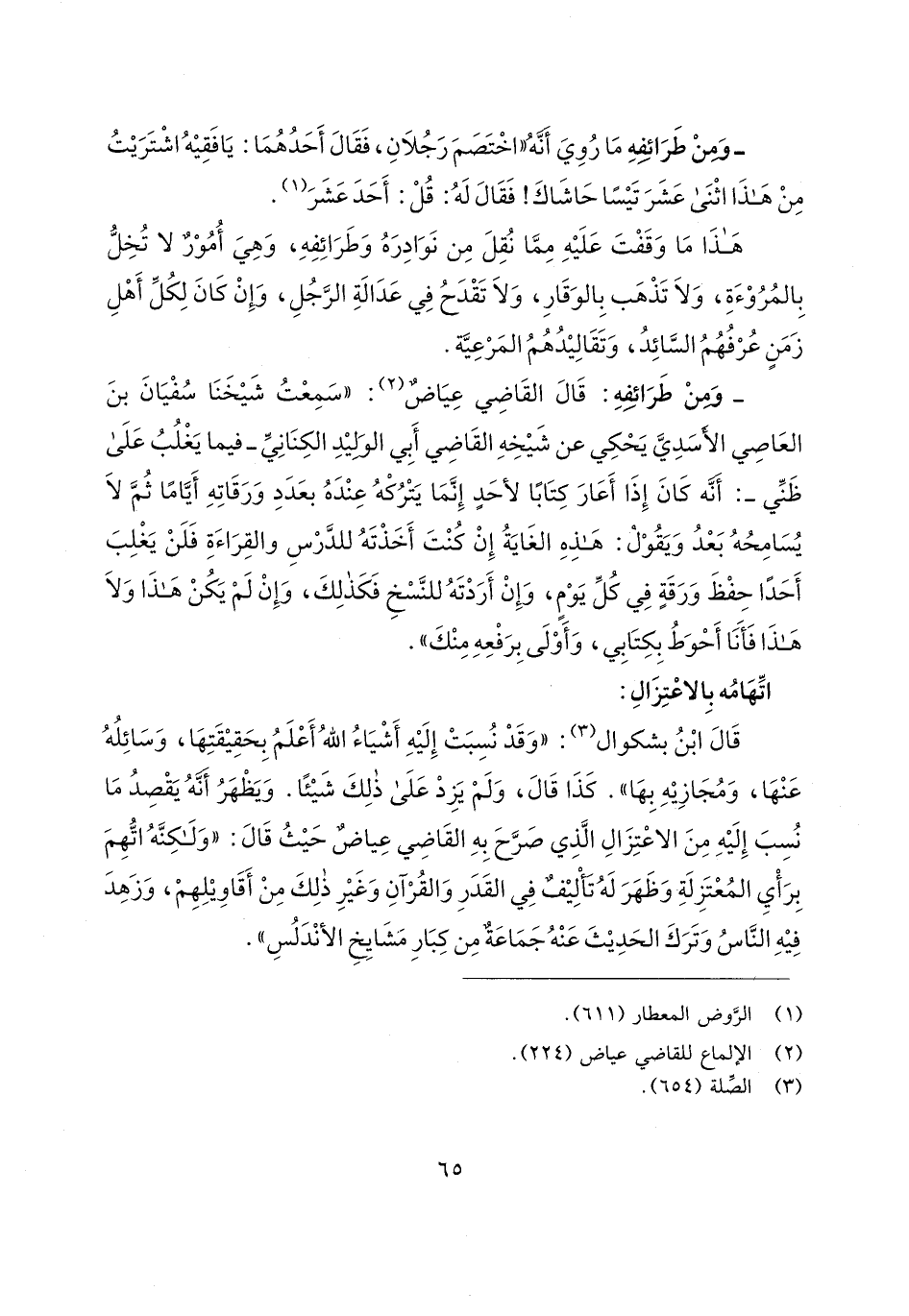 قَال ابْنُ بشكوال (¬3): "وَقَدْ نُسِبَتْ إِلَيْهِ أَشْيَاءُ اللهُ أَعْلَمُ بِحَقِيْقَتِهَا، وَسَائِلُهُ عَنْهَا، وَمُجَازِيْهِ بِهَا". كَذَا قَال، وَلَمْ يَزِدْ عَلَى ذلِكَ شَيْئًا. وَيَظْهَرُ أَنَّهُ يَقْصِدُ مَا نُسِبَ إِلَيْهِ مِنَ الاعْتِزَالِ الَّذِي صَرَّحَ بِهِ القَاضِي عِياضٌ حَيْثُ قَال: "وَلكِنَّهُ اتُّهِمَ بِرَأْيِ المُعْتَزِلَةِ وَظَهَرَ لَهُ تأْلِيْفٌ فِي القَدَرِ وَالقُرْآنِ وَغَيْرِ ذلِكَ مِنْ أَقَاويْلِهِمْ، وَزَهِدَ فِيْهِ النَّاسُ وَتَرَكَ الحَدِيْثَ عَنْهُ جَمَاعَةٌ مِن كِبَارِ مَشَايِخِ الأنْدَلُسِ".