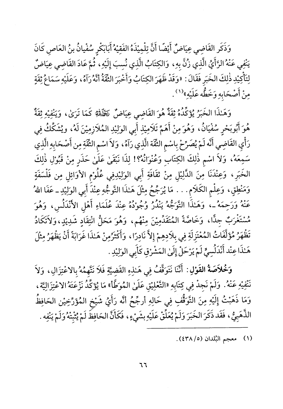 وَهَذَا الخَبَرُ يُؤَكِّدُهُ ثِقَةٌ هُوَ القَاضِي عِيَاضٌ -رحمه الله- كَمَا تَرَى، وَيَنْفِيْهِ ثِقَةٌ هُوَ أَبُو بَحْرٍ سُفْيَانُ، وَهُوَ مِنْ أَهَمِّ تَلامِيْذِ أَبِي الوَليْدِ المُلازِمِيْنَ لَهُ، ويُشَكِّكُ فِي رَأْيِ القَاضِي أَنَّه لَمْ يُصَرِّحْ بِاسْمِ الثِّقَة الَّذِي رَآهُ، وَلَا اسْمِ الثِّقَةِ مِن أَصْحَابِهِ الَّذِي سَمِعَهُ، وَلَا اسْمِ ذلِكَ الكِتَابِ وَعُنْوَانُهُ؟ ! لِذَا نَبْقَى عَلَى حَذَرٍ مِنْ قَبُوْلِ ذلِكَ الخَبَرِ، وَعِنْدَنَا مِنَ الدَّلِيْلِ مِنْ ثقَافَةِ أَبِي الوَليْدِ فِي عُلُوْمِ الأوَائِلِ مِن فَلْسَفَةٍ وَمَنْطِقٍ، وَعِلْمِ الكَلامٍ ... مَا يُرَجِّحُ مِثْلَ هَذَا التَّوجُّهِ عِنْدَ أَبي الوَليْدِ -عَفَا اللهُ عَنْهُ وَرَحِمَهُ-، وَهَذا التَّوَجُّهُ يَنْدُرُ وُجُوْدُهُ عِنْدَ عُلَمَاءِ أَهْلِ الأَنْدَلُسِ، وَهُوَ مُسْتَغْرَبٌ جِدًّا، وَخَاصَّةً المُتَقَدِّمِيْنَ مِنْهُم، وَهُوَ مَحَلُّ انْتِقَادٍ شَدِيْدٍ، وَلَا تكَادُ تَظْهَرُ مُؤَلَّفَاتُ المُعْتَزِلَةِ فِي بِلادِهِمْ إِلَّا نَادِرًا، وَأَكْثَرُ مِنْ هَذَا غَرَابَةً أَنْ يَظْهَرُ مِثْلَ هَذَا عِنْد أَنْدَلُسِيٍّ لَمْ يَرْحَلْ إِلَى المَشْرْقِ كَأَبي الوَليْدِ.