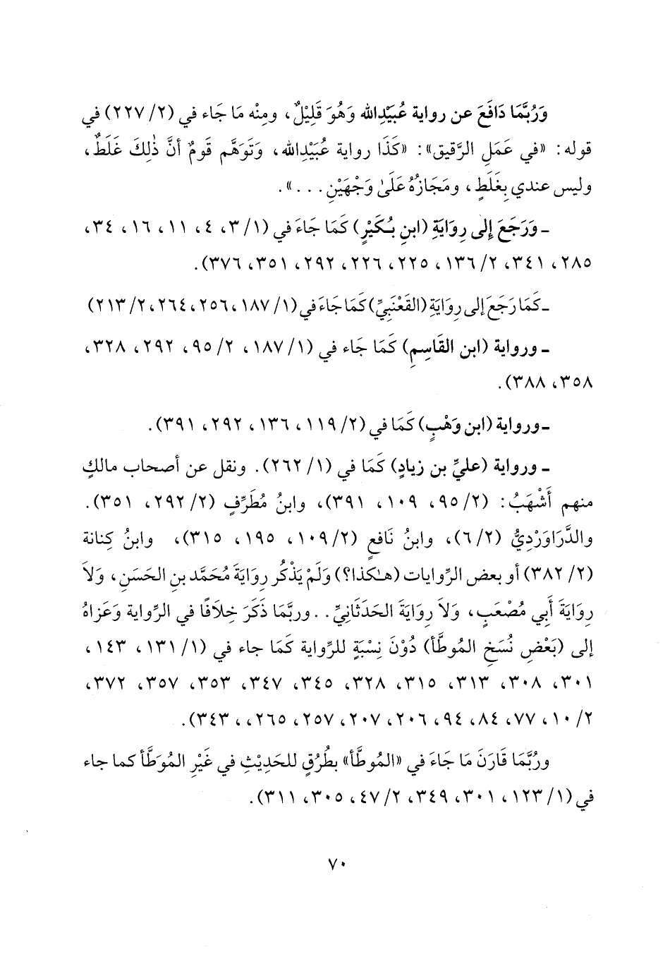 والدَّرَاوَرْدِيُّ (2/ 6)، وابنُ نَافعٍ (2/ 109، 195، 315)، وابنُ كِنانة (2/ 382) أو بعض الرِّوايات (هكذا؟ ) وَلَمْ يَذْكُر رِوَايَةَ مُحَمَّد بنِ الحَسَنِ، وَلَا رِوَايَةَ أَبِي مُصْعَبٍ، وَلَا رِوَايَةَ الحَدَثَانِيِّ .. وربَّمَا ذَكَرَ خِلافًا في الرِّواية وَعَزاهُ إلى (بَعْضِ نُسَخِ المُوطَّأ) دُوْنَ نِسْبَةٍ للرِّواية كَمَا جاء في (1/ 131، 143، 301، 308، 313، 315، 328، 345، 347، 353، 357، 372، 2/ 10، 77، 84، 94، 206، 207، 257، 265، ، 343).