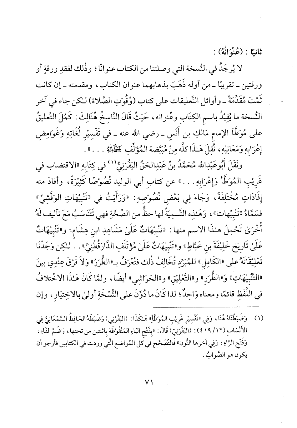 ونَقَلَ أَبُو عَبْدِ الله مُحَمَّدُ بنُ عَبْدِ الحَقِّ اليَفُرَنِيُّ (¬1) في كِتَابِهِ "الاقتضاب في غَرِيْبِ المُوَطَّأ وَإِعْرَابِهِ ... " عن كتابِ أبي الوليد نُصُوْصًا كَثيْرَةً، وأفادَ منه إِفَادَاتٍ مُخْتَلِفَةً، وَجَاءَ فِي بَعْضِ نُصُوْصِهِ: "وَرَأَيْتُ في "تَنْبِيْهَاتِ الوَقَّشِيِّ" فسَمَّاهُ "تَنْبِيْهات"، وَهَذِه التَّسمِيَةُ لها حظٌّ من الصِّحَّةِ فهي تَتَنَاسَبُ مَعَ تآليف لَهُ أُخْرَى تَحْمِلُ هذَا الاسم منها: "تَنْبِيْهَاتٌ عَلَى مَشَاهِدِ ابنِ هِشَامٍ" و"تَنْبِيْهَاتٌ عَلَى تَارِيْخ خَلِيْفَةَ بنِ خَيَّاطٍ" و"تَنْبِيْهَاتٌ عَلَى مُؤْتَلَفِ الدَّارَقُطْنِيِّ" .. لكِن وَجَدْنَا تَعْلِيْقَاتَهُ على "الكَامِلِ" للمُبَرِّدِ تُخَالِفُ ذلك فتُعْرَفُ بـ"الطُّرَرُ" وَلَا فَرْقَ عِنْدِي بينَ "التَّنْبِيْهَاتِ" وَ"الطُرَرِ" و"التَّعْلِيْقِ" و"الحَوَاشِي" أيضًا، ولمَّا كَانَ هَذَا الاخْتلافُ في اللَّفْظِ قائمًا ومعناه وَاحِدٌ؛ لذا كَانَ ما دُوِّنَ على النُّسْخَةِ أولى بالاخِتيَارِ، وإن