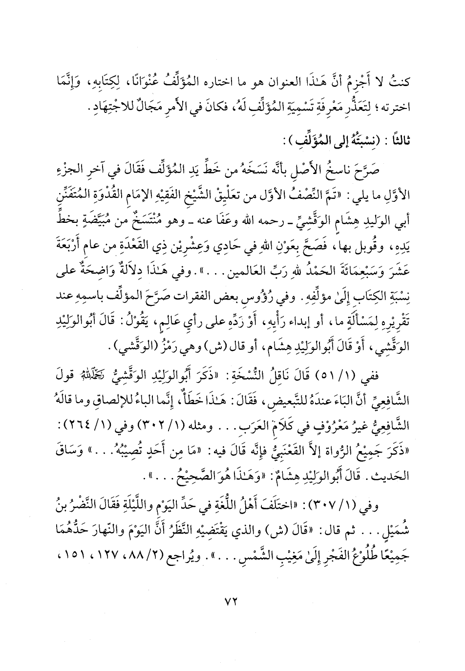 ففي (1/ 51) قَال نَاقِلُ النُّسْخَةِ: "ذَكَرَ أَبُو الوَليْدِ الوَقَّشِيُّ -رحمه الله- قولَ الشَّافِعِيِّ أنَّ البَاءَ عندَهُ للتَّبعيضِ، فَقَال: هَذَا خَطَأٌ، إِنَّما الباءُ للإلصاقِ وما قالهُ الشَّافِعِيُّ غيرُ مَعْرُوْفٍ في كَلامِ العَرَبِ ... ومثله (1/ 302) وفي (1/ 264): "ذَكَرَ جَمِيع الرُّواة إلَّا القَعْنَبِيُّ فإِنَّه قَال فيه: "مَا مِن أَحَدٍ تُصيْبُهُ ... " وَسَاقَ الحَديث. قَال أَبُو الوَليْدِ هِشَامٌ: "وَهَذَا هُوَ الصَّحِيْحُ ... ".