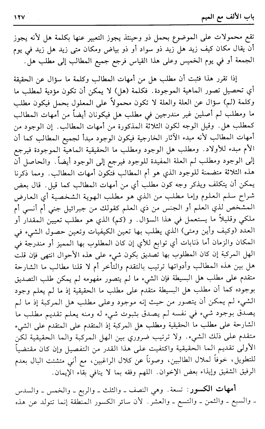 إِذا تقرر هَذَا فَثَبت أَن مطلب هَل من أُمَّهَات المطالب وَكلمَة مَا سُؤال عَن الْحَقِيقَة أَي تَحْصِيل تصور الْمَاهِيّة الْمَوْجُودَة. فكلمة (هَل) لَا يُمكن أَن تكون مؤدية لمطلب مَا وَكلمَة (لم) سُؤال عَن الْعلَّة وَالْعلَّة لَا تكون مَحْمُولا على الْمَعْلُول بِحمْل فَيكون مطلب مَا ومطلب لم أصلين غير مندرجين فِي مطلب هَل فيكونان أَيْضا من أُمَّهَات المطالب كمطلب هَل. وَقيل الْوَجْه لكَون الثَّلَاثَة الْمَذْكُورَة من أُمَّهَات المطالب. إِن الْوُجُود من أُمَّهَات المطالب لِأَنَّهُ مبدء الْآثَار الخارجية فَيكون الْوُجُود مبدأ لجَمِيع المطالب كَمَا أَن الْأُم مبدء للأولاد. ومطلب هَل الْوُجُود ومطلب مَا الْحَقِيقِيَّة الْمَاهِيّة الْمَوْجُودَة فَيرجع إِلَى الْوُجُود ومطلب لم الْعلَّة المفيدة للوجود فَيرجع إِلَى الْوُجُود أَيْضا. وَالْحَاصِل أَن هَذِه الثَّلَاثَة متضمنة للوجود الَّذِي هُوَ أم المطالب فَتكون أُمَّهَات المطالب. وَمِمَّا ذكرنَا يُمكن أَن يتَكَلَّف وَيذكر وَجه كَون مطلب أَي من أُمَّهَات المطالب كَمَا قيل. قَالَ بعض شرَّاح سلم الْعُلُوم وَإِمَّا مطلب من الَّذِي هُوَ مطلب الهوية الشخصية أَي الْعَارِض المشخص لذِي الْعلم أَو الْجِنْس من ذِي الْعلم كَقَوْلِك من جِبْرَائِيل جني أم أنسي أم ملكي وقليلا مَا يسْتَعْمل فِي هَذَا السُّؤَال. و (كم) الَّذِي هُوَ مطلب تعْيين الْمِقْدَار أَو الْعدَد (وَكَيف وَأَيْنَ وَمَتى) الَّذِي يطْلب بهَا تعين الكيفيات وَتعين حُصُول الشَّيْء فِي الْمَكَان وَالزَّمَان أما ذنابات أَي تَوَابِع للأي إِن كَانَ الْمَطْلُوب بهَا الْمُمَيز أَو مندرجة فِي الهل المركبة إِن كَانَ الْمَطْلُوب بهَا تَصْدِيق بِكَوْن شَيْء على هَذِه الْأَحْوَال انْتهى فَإِن قلت هَل بَين هَذِه المطالب وأدواتها تَرْتِيب بالتقدم والتأخر أم لَا قُلْنَا مطَالب مَا الشارحة مُتَقَدم على مطلب هَل البسيطة فَإِن الشَّيْء مَا لم يتَصَوَّر مَفْهُومه لم يُمكن طلب التَّصْدِيق بِوُجُودِهِ كَمَا أَن مطلب هَل البسيطة مُتَقَدم على مطلب مَا الْحَقِيقِيَّة إِذْ مَا لم يعلم وجود الشَّيْء لم يُمكن أَن يتَصَوَّر من حَيْثُ إِنَّه مَوْجُود وعَلى مطلب هَل المركبة إِذْ مَا لم يصدق بِوُجُود شَيْء فِي نَفسه لم يصدق بِثُبُوت شَيْء لَهُ وَمِنْه يعلم تَقْدِيم مطلب مَا الشارحة على مطلب مَا الْحَقِيقِيَّة ومطلب هَل المركبة إِذْ الْمُتَقَدّم على الْمُتَقَدّم على الشَّيْء مُتَقَدم على ذَلِك الشَّيْء. وَلَا تَرْتِيب ضَرُورِيّ بَين الهل المركبة والما الْحَقِيقِيَّة لَكِن الأولى تَقْدِيم الما الْحَقِيقِيَّة واكتفيت على هَذَا الْقدر من التَّفْصِيل وَإِن كَانَ مقتضيا للتطويل، خوفًا لملال الطالبين، وصونا عَن كلال الراغبين، مَعَ أَنِّي متشتت البال بِعَدَمِ الرفيق الشفيق وإيذاء بعض الإخوان. اللَّهُمَّ وَفقه بِمَا لَا يُنَافِي بَقَاء الْإِيمَان.
