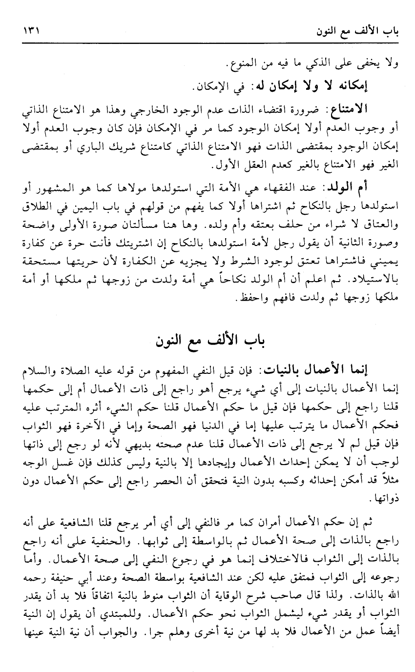 إِنَّمَا الْأَعْمَال بِالنِّيَّاتِ: فَإِن قيل النَّفْي الْمَفْهُوم من قَوْله عَلَيْهِ الصَّلَاة وَالسَّلَام إِنَّمَا الْأَعْمَال بِالنِّيَّاتِ إِلَى أَي شَيْء يرجع أهوَ رَاجع إِلَى ذَات الْأَعْمَال أم إِلَى حكمهَا قُلْنَا رَاجع إِلَى حكمهَا فَإِن قيل مَا حكم الْأَعْمَال قُلْنَا حكم الشَّيْء أَثَره الْمُتَرَتب عَلَيْهِ فَحكم الْأَعْمَال مَا يَتَرَتَّب عَلَيْهَا إِمَّا فِي الدُّنْيَا فَهُوَ الصِّحَّة وَإِمَّا فِي الْآخِرَة فَهُوَ الثَّوَاب فَإِن قيل لم لَا يرجع إِلَى ذَات الْأَعْمَال قُلْنَا عدم صِحَّته بديهي لِأَنَّهُ لَو رَجَعَ إِلَى ذَاتهَا لوَجَبَ أَن لَا يُمكن إِحْدَاث الْأَعْمَال وإيجادها إِلَّا بِالنِّيَّةِ وَلَيْسَ كَذَلِك فَإِن غسل الْوَجْه مثلا قد أمكن إحداثه وَكَسبه بِدُونِ النِّيَّة فتحقق أَن الْحصْر رَاجع إِلَى حكم الْأَعْمَال دون ذواتها.