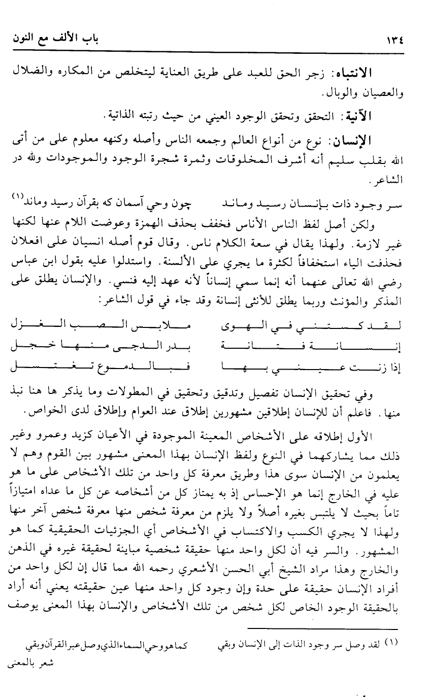 الأول إِطْلَاقه على الْأَشْخَاص الْمعينَة الْمَوْجُودَة فِي الْأَعْيَان كزيد وَعَمْرو وَغير ذَلِك مِمَّا يشاركهما فِي النَّوْع وَلَفظ الْإِنْسَان بِهَذَا الْمَعْنى مَشْهُور بَين الْقَوْم وهم لَا يعلمُونَ من الْإِنْسَان سوى هَذَا وَطَرِيق معرفَة كل وَاحِد من تِلْكَ الْأَشْخَاص على مَا هُوَ عَلَيْهِ فِي الْخَارِج إِنَّمَا هُوَ الإحساس إِذْ بِهِ يمتاز كل من أشخاصه عَن كل مَا عداهُ امتيازا تَاما بِحَيْثُ لَا يلتبس بِغَيْرِهِ أصلا وَلَا يلْزم من معرفَة شخص مِنْهَا معرفَة شخص آخر مِنْهَا وَلِهَذَا لَا يجْرِي الْكسْب والاكتساب فِي الْأَشْخَاص أَي الجزئيات الْحَقِيقِيَّة كَمَا هُوَ الْمَشْهُور. والسر فِيهِ أَن لكل وَاحِد مِنْهَا حَقِيقَة شخصية مباينة لحقيقة غَيره فِي الذِّهْن وَالْخَارِج وَهَذَا مُرَاد الشَّيْخ أبي الْحسن الْأَشْعَرِيّ رَحمَه الله مِمَّا قَالَ إِن لكل وَاحِد من أَفْرَاد الْإِنْسَان حَقِيقَة على حِدة وَإِن وجود كل وَاحِد مِنْهَا عين حَقِيقَته يَعْنِي أَنه أَرَادَ بِالْحَقِيقَةِ الْوُجُود الْخَاص لكل شخص من تِلْكَ الْأَشْخَاص وَالْإِنْسَان بِهَذَا الْمَعْنى يُوصف