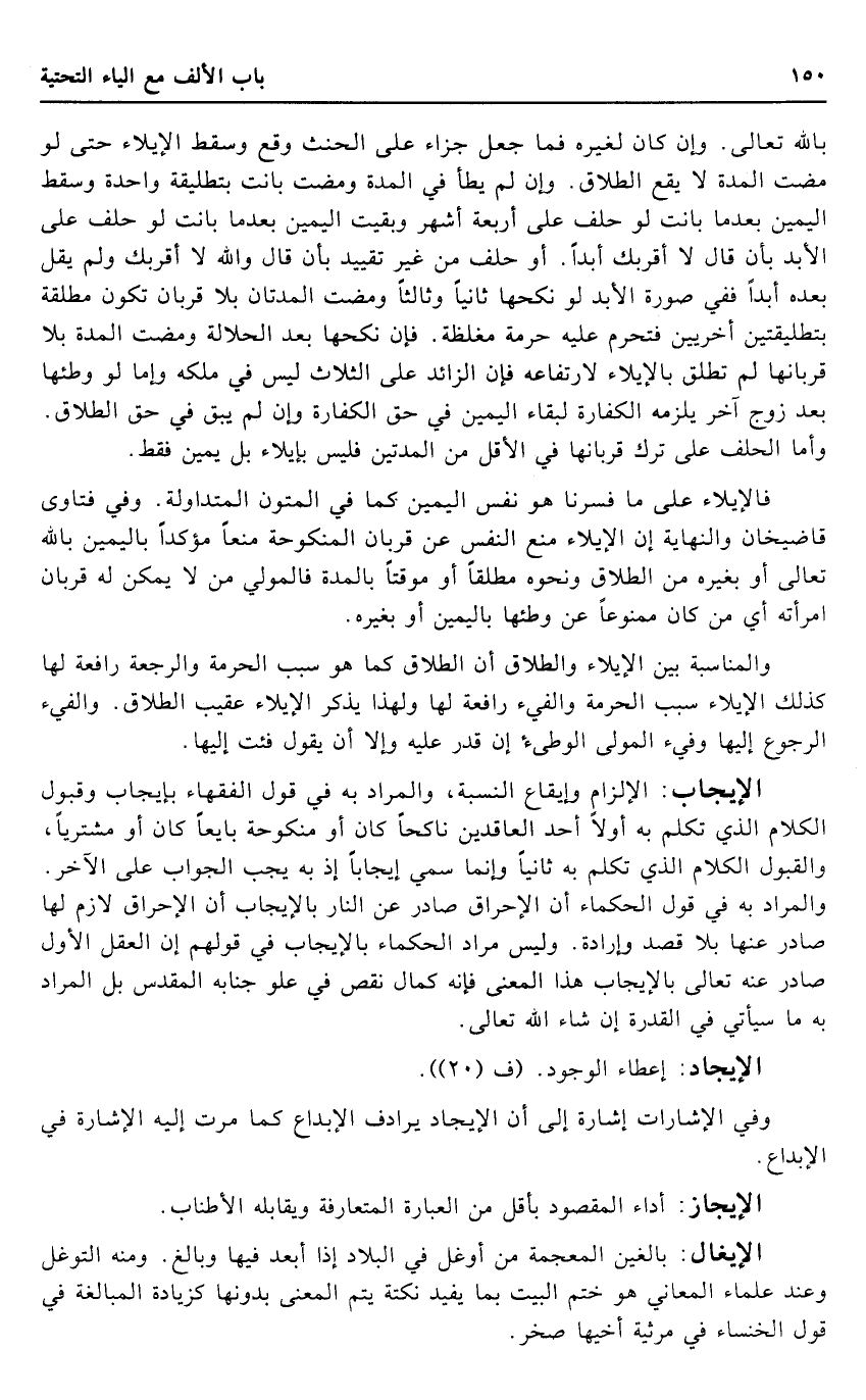 الْإِيجَاب: الْإِلْزَام وإيقاع النِّسْبَة، وَالْمرَاد بِهِ فِي قَول الْفُقَهَاء بِإِيجَاب وَقبُول الْكَلَام الَّذِي تكلم بِهِ أَولا أحد الْعَاقِدين ناكحا كَانَ أَو مَنْكُوحَة بايعا كَانَ أَو مُشْتَريا، وَالْقَبُول فِي الْكَلَام الَّذِي تكلم بِهِ ثَانِيًا وَإِنَّمَا سمي إِيجَابا إِذْ بِهِ يجب الْجَواب على الآخر. وَالْمرَاد بِهِ فِي قَول الْحُكَمَاء أَن الإحراق صادر عَن النَّار بِالْإِيجَابِ أَن الإحراق لَازم لَهَا صادر عَنْهَا بِلَا قصد وَإِرَادَة. وَلَيْسَ مُرَاد الْحُكَمَاء بِالْإِيجَابِ فِي قَوْلهم إِن الْعقل الأول صادر عَنهُ تَعَالَى بِالْإِيجَابِ هَذَا الْمَعْنى فَإِنَّهُ كَمَال نقص فِي علو جنابه الْمُقَدّس بل المُرَاد بِهِ مَا سَيَأْتِي فِي الْقُدْرَة إِن شَاءَ الله تَعَالَى.
