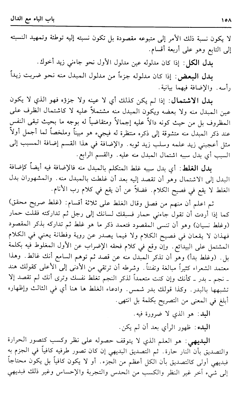 ثمَّ اعْلَم أَن مِنْهُم من فصل وَقَالَ الْغَلَط على ثَلَاثَة أَقسَام: (غلط صَرِيح مُحَقّق) كَمَا إِذا أردْت أَن تَقول جَاءَنِي حمَار فسبقك لسَانك إِلَى رجل ثمَّ تداركته فَقلت حمَار (وَغلط نِسْيَان) وَهُوَ أَن تنسى الْمَقْصُود فتعمد ذكر مَا هُوَ غلط ثمَّ تَدَارُكه بِذكر الْمَقْصُود فهذان لَا يقعان فِي فصيح الْكَلَام وَلَا فِيمَا يصدر عَن روية وفطانة يَعْنِي فِي الْكَلَام الْمُشْتَمل على البيدائع. وَإِن وَقع فِي كَلَام فحقه الإضراب عَن الأول المغلوط فِيهِ بِكَلِمَة بل. (وَغلط بَدَأَ) وَهُوَ أَن تذكر الْمُبدل مِنْهُ عَن قصد ثمَّ توهم السَّامع أَنَّك غالط. وَهَذَا مُعْتَمد الشُّعَرَاء كثيرا مُبَالغَة وتفننا. وَشَرطه أَن ترتقي من الْأَدْنَى إِلَى الْأَعْلَى كَقَوْلِك هِنْد - نجم - بدر - كَأَنَّك وَإِن كنت مُتَعَمدا لذكر النَّجْم تغلط نَفسك وَترى أَنَّك لم تقصد إِلَّا تشبهها بالبدر. وَكَذَا قَوْلك بدر شمس. وادعاء الْغَلَط هَا هُنَا أَي فِي الثَّالِث وأظهاره أبلغ فِي الْمَعْنى من التَّصْرِيح بِكَلِمَة بل انْتهى.