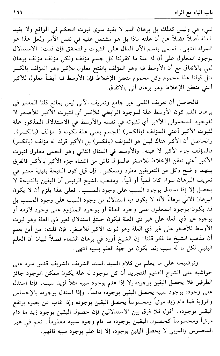 وتوضيحه على مَا يعلم من كَلَام السَّيِّد السَّنَد الشريف الشريف قدس سره على حَوَاشِيه على الشَّرْح الْقَدِيم للتجريد أَن كل مَوْجُود لَهُ عِلّة يكون مُمكن الْوُجُود جَائِز الطَّرفَيْنِ فَلَا يحصل الْيَقِين بِوُجُودِهِ إِلَّا إِذا علم بِوُجُود سَببه مثلا لزيد سَبَب. فَإِذا اسْتدلَّ على وجوده بِوُجُود سَببه يحصل الْيَقِين بِوُجُودِهِ دَائِما. وَإِذا اسْتدلَّ بِوُجُودِهِ بالإحساس والرؤية فَمَا دَامَ زيد مرئيا ومحسوسا يحصل الْيَقِين بِوُجُودِهِ وَإِذا غَابَ عَن بَصَره يرْتَفع الْيَقِين بِوُجُودِهِ. أَقُول فَلَا فرق بَين الاستدلالين فَإِن حُصُول الْيَقِين بِوُجُود زيد مَا دَامَ مرئيا ومحسوسا كحصول الْيَقِين بِوُجُودِهِ مَا دَامَ وجود سَببه مَعْلُوما. نعم فِي غير المحسوس والمربي لَا يحصل الْيَقِين بِوُجُودِهِ إِلَّا إِذا علم بِوُجُود سَببه فَافْهَم.