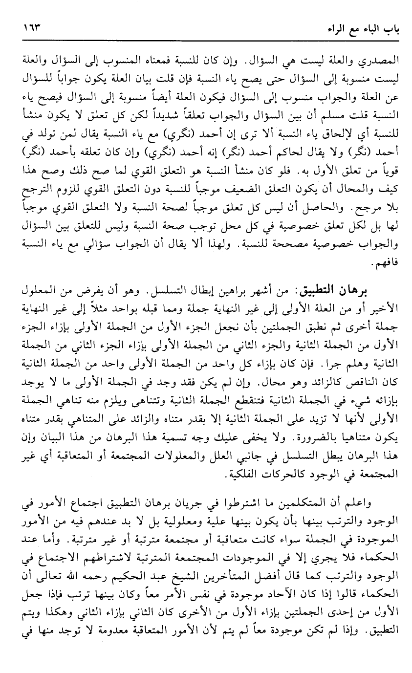وَاعْلَم أَن الْمُتَكَلِّمين مَا اشترطوا فِي جَرَيَان برهَان التطبيق اجْتِمَاع الْأُمُور فِي الْوُجُود وَالتَّرْتِيب بَينهَا بِأَن يكون بَينهَا علية ومعلولية بل لَا بُد عِنْدهم فِيهِ من الْأُمُور الْمَوْجُودَة فِي الْجُمْلَة سَوَاء كَانَت متعاقبة أَو مجتمعة مترتبة أَو غير مترتبة. وَأما عِنْد الْحُكَمَاء فَلَا يجْرِي إِلَّا فِي الموجودات المجتمعة المترتبة لاشتراطهم الِاجْتِمَاع فِي الْوُجُود وَالتَّرْتِيب كَمَا قَالَ أفضل الْمُتَأَخِّرين الشَّيْخ عبد الْحَكِيم رَحمَه الله تَعَالَى أَن الْحُكَمَاء قَالُوا إِذا كَانَ الْآحَاد مَوْجُودَة فِي نفس الْأَمر مَعًا وَكَانَ بَينهَا ترَتّب فَإِذا جعل الأول من إِحْدَى الجملتين بِإِزَاءِ الأول من الْأُخْرَى كَانَ الثَّانِي بِإِزَاءِ الثَّانِي وَهَكَذَا وَيتم التطبيق وَإِذا لم تكن مَوْجُودَة مَعًا لم يتم لِأَن الْأُمُور المتعاقبة مَعْدُومَة لَا تُوجد مِنْهَا فِي