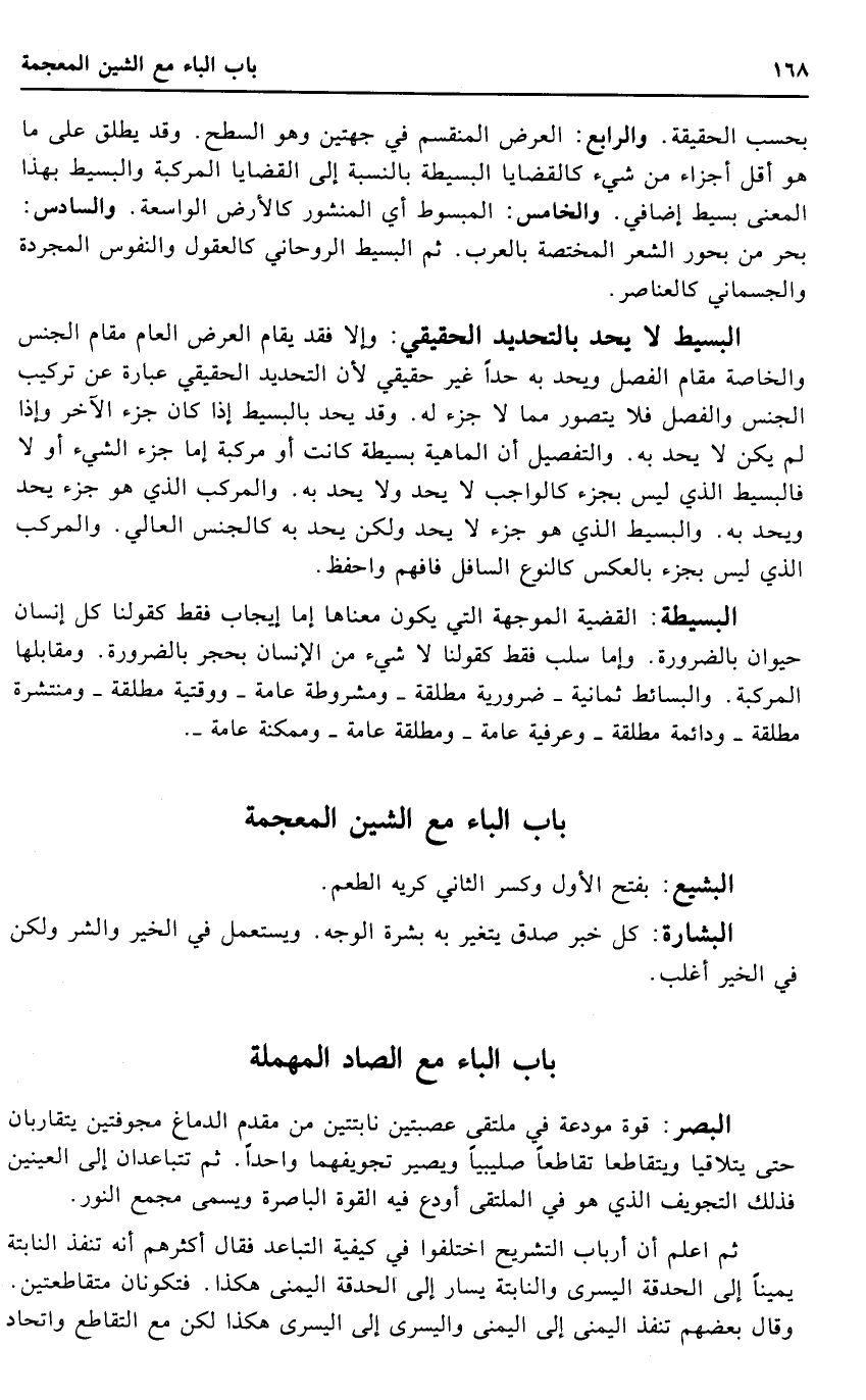 بِحَسب الْحَقِيقَة. وَالرَّابِع: الْعرض المنقسم فِي جِهَتَيْنِ وَهُوَ السَّطْح. وَقد يُطلق على مَا هُوَ أقل أَجزَاء من شَيْء كالقضايا البسيطة بِالنِّسْبَةِ إِلَى القضايا المركبة والبسيط بِهَذَا الْمَعْنى بسيط إضافي. وَالْخَامِس: الْمَبْسُوط أَي المنشور كالأرض الواسعة. وَالسَّادِس: بَحر من بحور الشّعْر المختصة بالعرب. ثمَّ الْبَسِيط الروحاني كالعقول والنفوس الْمُجَرَّدَة والجسماني كالعناصر.