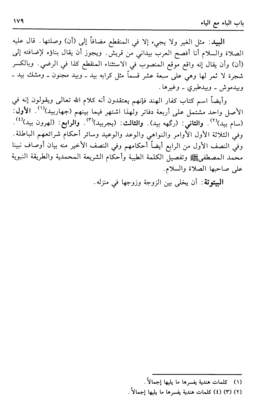 وَأَيْضًا اسْم كتاب كفار الْهِنْد فَإِنَّهُم يَعْتَقِدُونَ أَنه كَلَام الله تَعَالَى وَيَقُولُونَ إِنَّه فِي الأَصْل وَاحِد مُشْتَمل على أَرْبَعَة دفاتر وَلِهَذَا اشْتهر فِيمَا بَينهم (جهاربيد) . الأول: (سَام بيد) . وَالثَّانِي: (ركهه بيد) . وَالثَّالِث: (يجربيد) . وَالرَّابِع: (لهرون بيد) . وَفِي الثَّلَاثَة الأول الْأَوَامِر والنواهي والوعد والوعيد وَسَائِر أَحْكَام شرائعهم الْبَاطِلَة. وَفِي النّصْف الأول من الرَّابِع أَيْضا أحكامهم وَفِي النّصْف الْأَخير مِنْهُ بَيَان أَوْصَاف نَبينَا مُحَمَّد الْمُصْطَفى - صَلَّى اللَّهُ عَلَيْهِ وَسَلَّم َ - وتفصيل الْكَلِمَة الطّيبَة وَأَحْكَام الشَّرِيعَة المحمدية والطريقة النَّبَوِيَّة على صَاحبهَا الصَّلَاة وَالسَّلَام.