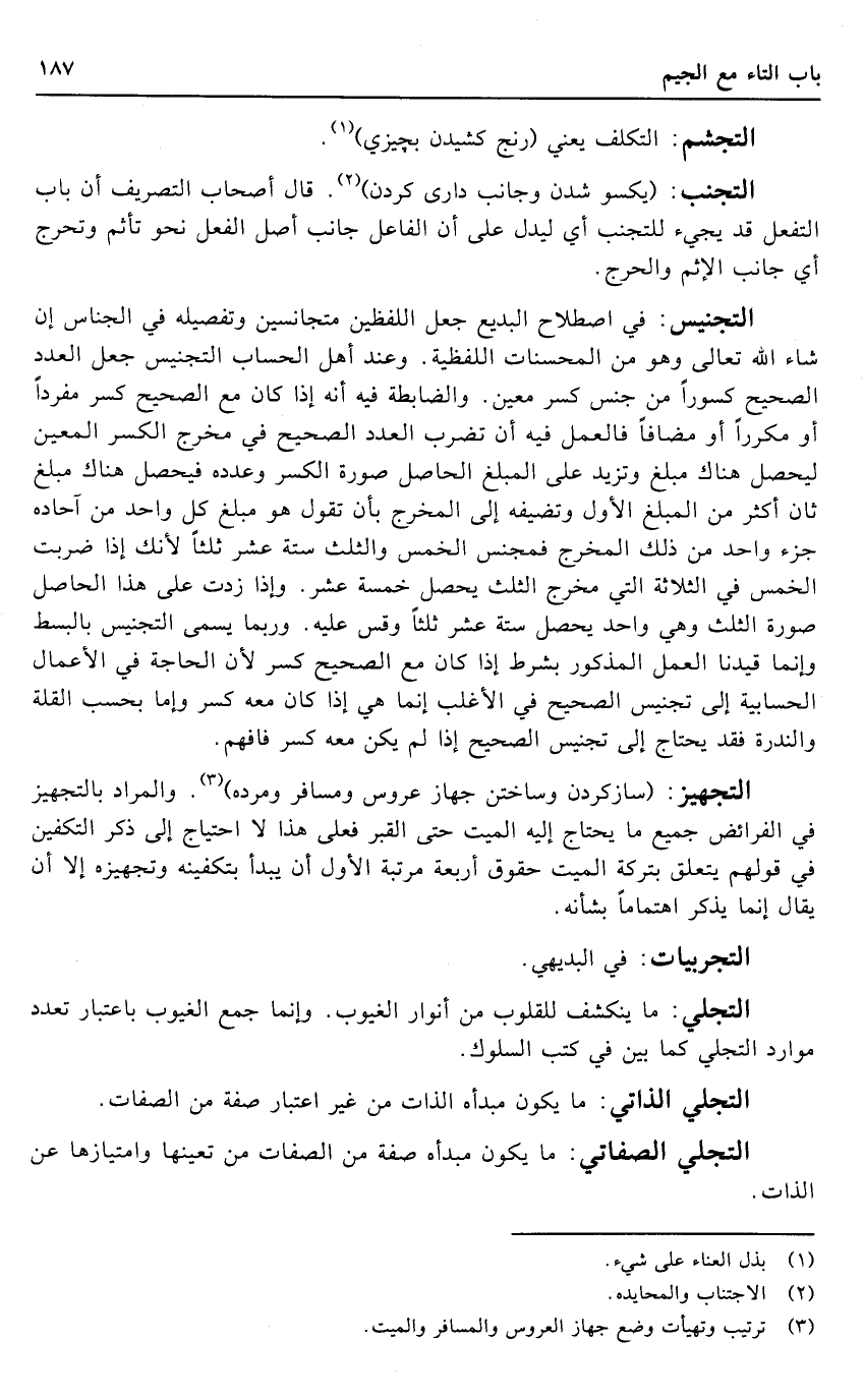 التجنب: يكسو شدن وجانب دارى كردن) . قَالَ أَصْحَاب التصريف أَن بَاب التفعل قد يَجِيء للتجنب أَي ليدل على أَن الْفَاعِل جَانب أصل الْفِعْل نَحْو تأثم وتحرج أَي جَانب الْإِثْم والحرج.