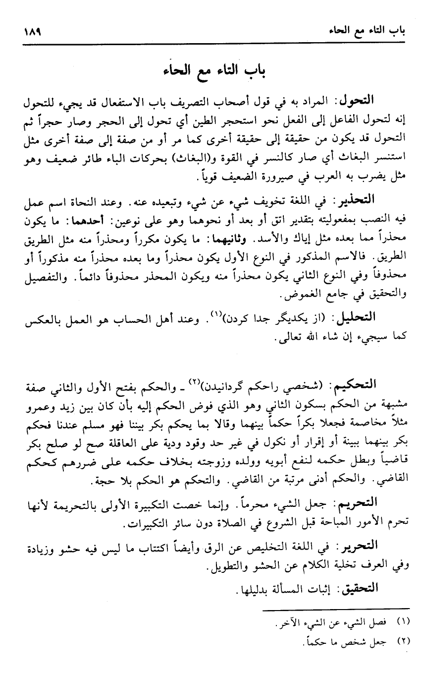 التَّحْكِيم: (شخصي راحكم كردانيدن) - وَالْحكم بِفَتْح الأول وَالثَّانِي صفة مشبهة من الحكم بِسُكُون الثَّانِي وَهُوَ الَّذِي فوض الحكم إِلَيْهِ بِأَن كَانَ بَين زيد وَعَمْرو مثلا مخاصمة فَجعلَا بكرا حكما بَينهمَا وَقَالا بِمَا يحكم بكر بَيْننَا فَهُوَ مُسلم عندنَا فَحكم بكر بَينهمَا بِبَيِّنَة أَو إِقْرَار أَو نُكُول فِي غير حد وقود ودية على الْعَاقِلَة صَحَّ لَو صلح بكر قَاضِيا وَبَطل حكمه لنفع أَبَوَيْهِ وَولده وَزَوجته بِخِلَاف حكمه على ضررهم كَحكم القَاضِي. وَالْحكم أدنى مرتبَة من القَاضِي. والتحكم هُوَ الحكم بِلَا حجَّة.