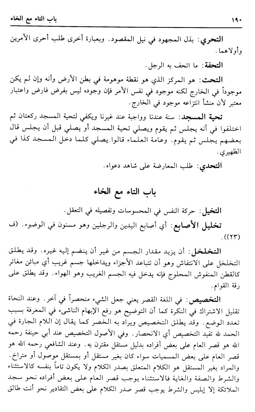 التَّخْصِيص: فِي اللُّغَة الْقصر يَعْنِي جعل الشَّيْء منحصرا فِي آخر. وَعند النُّحَاة تقليل الِاشْتِرَاك فِي النكرَة كَمَا أَن التَّوْضِيح هُوَ رفع الْإِبْهَام النَّاشِئ فِي الْمعرفَة بِسَبَب تعدد الْوَضع. وَقد يُطلق التَّخْصِيص وَيُرَاد بِهِ الخصر كَمَا يُقَال إِن اللَّام الجارة فِي الْحَمد لله تفِيد التَّخْصِيص أَي الانحصار. وَفِي الْأُصُول التَّخْصِيص عِنْد أبي حنيفَة رَحمَه الله هُوَ قصر الْعَام على بعض أَفْرَاده بِدَلِيل مُسْتَقل مقترن بِهِ. وَعند الشَّافِعِي رَحمَه الله هُوَ قصر الْعَام على بعض المسميات سَوَاء كَانَ بِغَيْر مُسْتَقل أَو بمستقل مَوْصُول أَو متراخ. وَالْمرَاد بِغَيْر المستقل هُوَ الْكَلَام الْمُتَعَلّق بصدر الْكَلَام وَلَا يكون تَاما بِنَفسِهِ كالاستثناء وَالشّرط وَالصّفة والغاية فالاستثناء يُوجب قصر الْعَام على بعض أَفْرَاده نَحْو سجد الْمَلَائِكَة إِلَّا إِبْلِيس وَالشّرط يُوجب قصر صدر الْكَلَام على بعض التقادير نَحْو أَنْت طَالِق