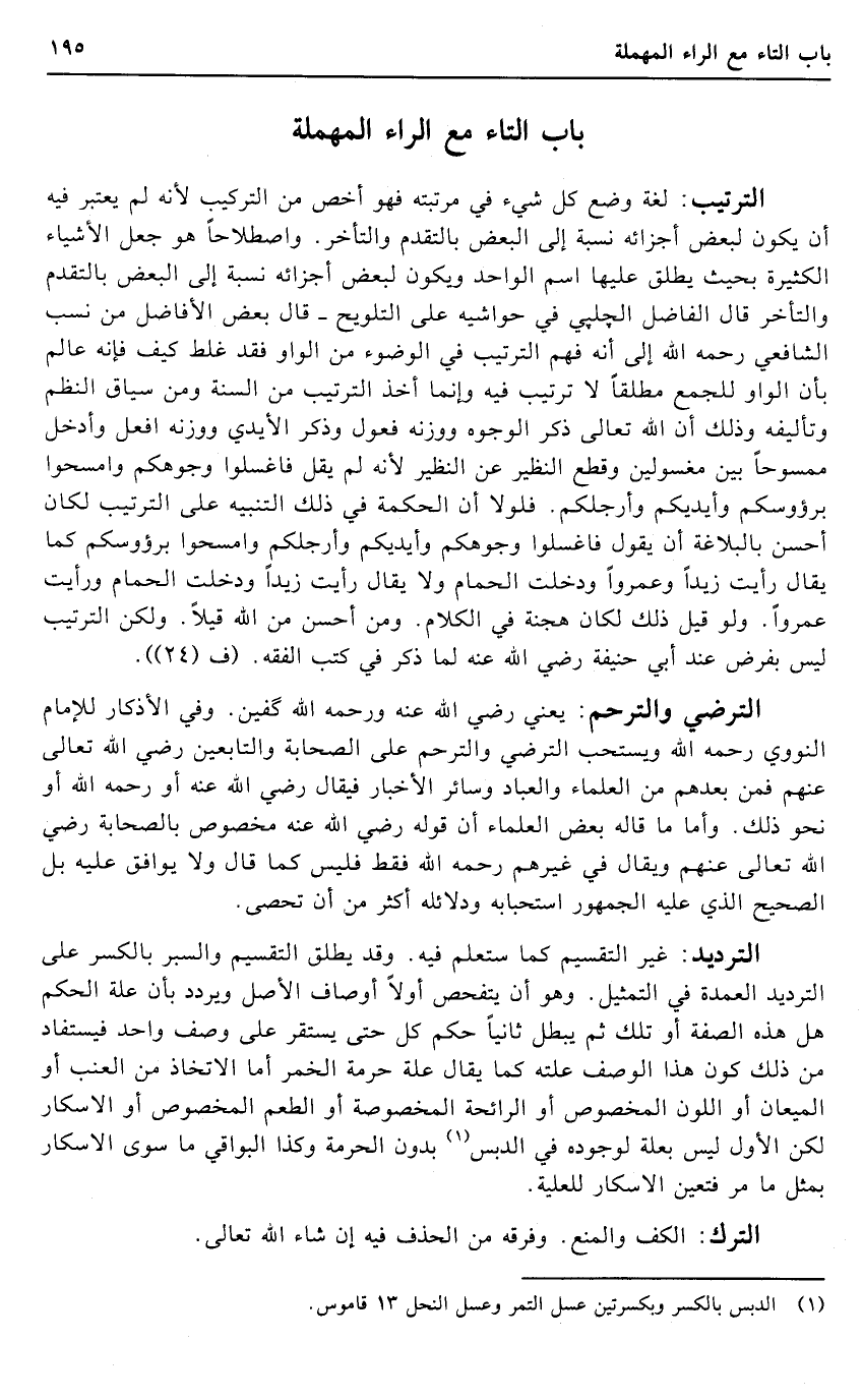 التَّرْتِيب: لُغَة وضع كل شَيْء فِي مرتبته فَهُوَ أخص من التَّرْكِيب لِأَنَّهُ لم يعْتَبر فِيهِ أَن يكون لبَعض أَجْزَائِهِ نِسْبَة إِلَى الْبَعْض بالتقدم والتأخر. وَاصْطِلَاحا هُوَ جعل الْأَشْيَاء الْكَثِيرَة بِحَيْثُ يُطلق عَلَيْهَا اسْم الْوَاحِد وَيكون لبَعض أَجْزَائِهِ نِسْبَة إِلَى الْبَعْض بالتقدم والتأخر قَالَ الْفَاضِل الجلبي فِي حَوَاشِيه على التَّلْوِيح - قَالَ بعض الأفاضل من نسب الشَّافِعِي رَحمَه الله إِلَى أَنه فهم التَّرْتِيب فِي الْوضُوء من الْوَاو فقد غلط كَيفَ فَإِنَّهُ عَالم بِأَن الْوَاو للْجمع مُطلقًا لَا تَرْتِيب فِيهِ وَإِنَّمَا أَخذ التَّرْتِيب من السّنة وَمن سِيَاق النّظم وتأليفه وَذَلِكَ أَن الله تَعَالَى ذكر الْوُجُوه ووزنه فعول وَذكر الْأَيْدِي ووزنه افْعَل وَأدْخل ممسوحا بَين مغسولين وَقطع النظير عَن النظير لِأَنَّهُ لم يقل فَاغْسِلُوا وُجُوهكُم وامسحوا برؤوسكم وَأَيْدِيكُمْ وأرجلكم. فلولا أَن الْحِكْمَة فِي ذَلِك التَّنْبِيه على التَّرْتِيب لَكَانَ أحسن بالبلاغة أَن يَقُول فَاغْسِلُوا وُجُوهكُم وَأَيْدِيكُمْ وأرجلكم وامسحوا برؤوسكم كَمَا يُقَال رَأَيْت زيدا وعمروا وَدخلت الْحمام وَلَا يُقَال رَأَيْت زيدا وَدخلت الْحمام وَرَأَيْت عمروا. وَلَو قيل ذَلِك لَكَانَ هجنة فِي الْكَلَام. وَمن أحسن من الله قيلا. وَلَكِن التَّرْتِيب لَيْسَ بِفَرْض عِنْد أبي حنيفَة رَضِي الله عَنهُ لما ذكر فِي كتب الْفِقْه. (ف (24)) .
