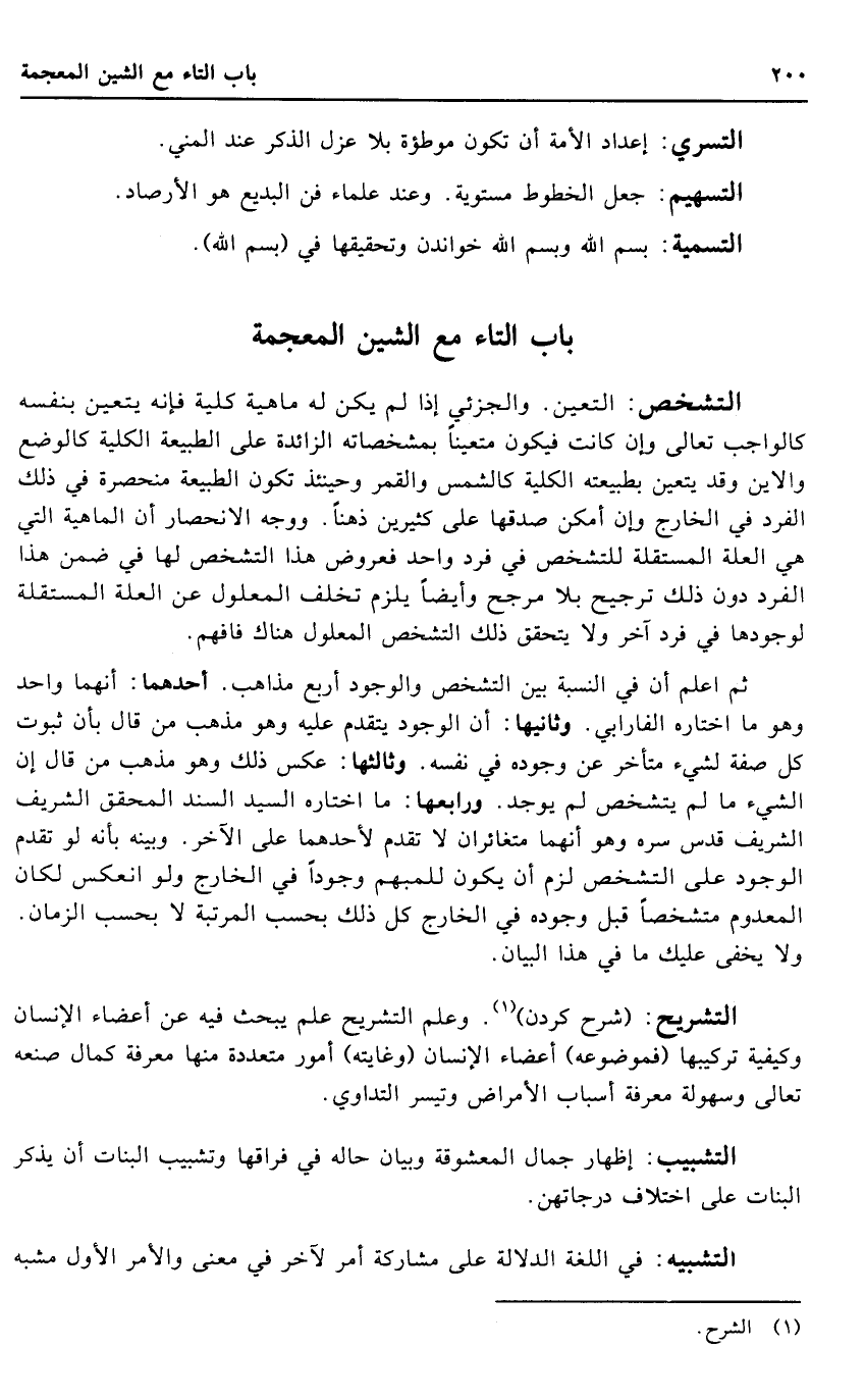 التشخص: التعين. والجزئي إِذا لم يكن لَهُ مَاهِيَّة كُلية فَإِنَّهُ يتَعَيَّن بِنَفسِهِ كالواجب تَعَالَى وَإِن كَانَت فَيكون مُتَعَيّنا بمشخصاته الزَّائِدَة على الطبيعة الْكُلية كالوضع والاين وَقد يتَعَيَّن بطبيعته الْكُلية كَالشَّمْسِ وَالْقَمَر وَحِينَئِذٍ تكون الطبيعة منحصرة فِي ذَلِك الْفَرد فِي الْخَارِج وَإِن أمكن صدقهَا على كثيرين ذهنا. وَوجه الانحصار أَن الْمَاهِيّة الَّتِي هِيَ الْعلَّة المستقلة للتشخص فِي فَرد وَاحِد فعروض هَذَا التشخص لَهَا فِي ضمن هَذَا الْفَرد دون ذَلِك تَرْجِيح بِلَا مُرَجّح وَأَيْضًا يلْزم تخلف الْمَعْلُول عَن الْعلَّة المستقلة لوجودها فِي فَرد آخر وَلَا يتَحَقَّق ذَلِك التشخص الْمَعْلُول هُنَاكَ فَافْهَم.