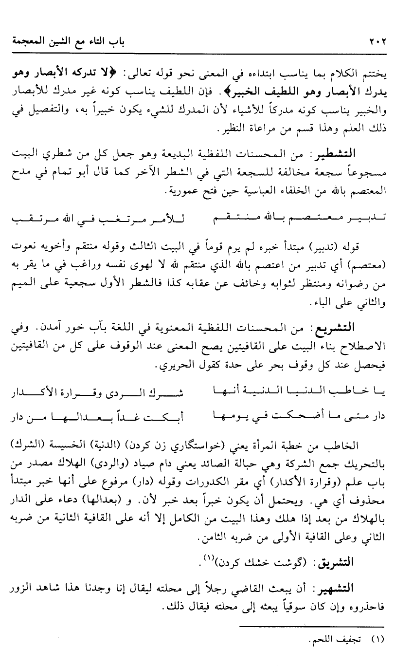 التشريع: من المحسنات اللفظية المعنوية فِي اللُّغَة بآب خور آمدن. وَفِي الِاصْطِلَاح بِنَاء الْبَيْت على القافيتين يَصح الْمَعْنى عِنْد الْوُقُوف على كل من القافيتين فَيحصل عِنْد كل وقُوف بَحر على حِدة كَقَوْل الحريري.