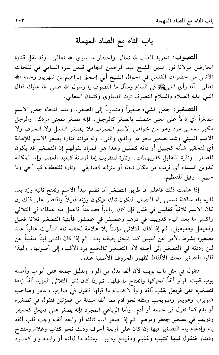 التصغير: جعل الشَّيْء صَغِيرا ومنسوبا إِلَى الصغر. وَعند النُّحَاة جعل الِاسْم مُصَغرًا أَي دَالا على معنى متصف بالصغر كالرجيل. فَإِنَّهُ مصغر بِمَعْنى مردك. وَالرجل مكبر بِمَعْنى مرد وَهُوَ من خَواص الِاسْم المعرب فَلَا يصغر الْفِعْل وَلَا الْحَرْف وَلَا الِاسْم الْمَبْنِيّ وَشد تَصْغِير نَحْو ذُو وَالَّذِي وَالَّتِي. وَله فَوَائِد فَتَارَة يصغر الِاسْم للإهانة أَي لتحقير شَأْنه كجبيل أَو ذَاته كطفيل وَهَذَا هُوَ المُرَاد بقَوْلهمْ إِن التصغر قد يكون للصغر. وَتارَة للتقليل كدريهمات. وَتارَة للتقريب إِمَّا لزمانة كبعيد الْعَصْر وَإِمَّا لمكانه كدوين السَّمَاء أَي قريب من مَكَان تَحْتَهُ أَو مَنْزِلَته كصديقي. وَتارَة للتعطف كيا أخي وَيَا حَبِيبِي. وَقيل للتعظيم.