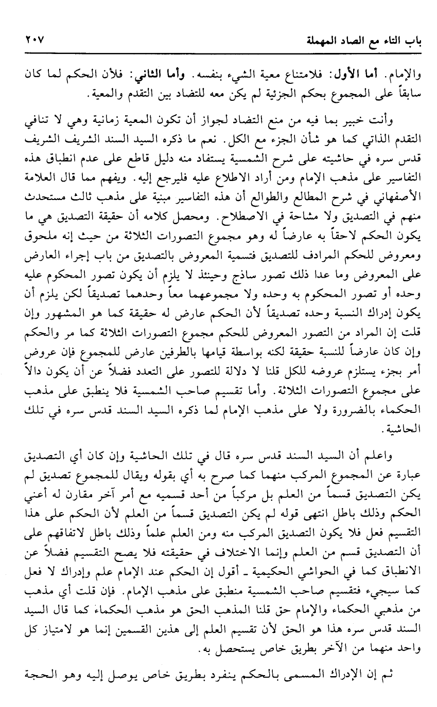 وَأَنت خَبِير بِمَا فِيهِ من منع التضاد لجَوَاز أَن تكون معية زمانية وَهِي لَا تنَافِي التَّقَدُّم الذاتي كَمَا هُوَ شَأْن الْجُزْء مَعَ الْكل. نعم مَا ذكره السَّيِّد السَّنَد الشريف الشريف قدس سره فِي حَاشِيَته على شرح الشمسية يُسْتَفَاد مِنْهُ دَلِيل قَاطع على عدم انطباق هَذِه التفاسير على مَذْهَب الإِمَام وَمن أَرَادَ الِاطِّلَاع عَلَيْهِ فَليرْجع إِلَيْهِ. وَيفهم مِمَّا قَالَ الْعَلامَة الْأَصْفَهَانِي فِي شرح الْمطَالع والطوالع أَن هَذِه التفاسير مَبْنِيَّة على مَذْهَب ثَالِث مستحدث مِنْهُم فِي التَّصْدِيق وَلَا مشاحة فِي الِاصْطِلَاح. ومحصل كَلَامه أَن حَقِيقَة التَّصْدِيق هِيَ مَا يكون الحكم لاحقا بِهِ عارضا لَهُ وَهُوَ مَجْمُوع التصورات الثَّلَاثَة من حَيْثُ إِنَّه ملحوق ومعروض للْحكم المرادف للتصديق فتسمية المعروض بالتصديق من بَاب إِجْرَاء الْعَارِض على المعروض وَمَا عدا ذَلِك تصور ساذج وَحِينَئِذٍ لَا يلْزم أَن يكون تصور الْمَحْكُوم عَلَيْهِ وَحده أَو تصور الْمَحْكُوم بِهِ وَحده وَلَا مجموعهما مَعًا وَحدهمَا تَصْدِيقًا لَكِن يلْزم أَن يكون إِدْرَاك النِّسْبَة وَحده تَصْدِيقًا لِأَن الحكم عَارض لَهُ حَقِيقَة كَمَا هُوَ الْمَشْهُور وَإِن قلت إِن المُرَاد من التَّصَوُّر المعروض للْحكم مَجْمُوع التصورات الثَّلَاثَة كَمَا مر وَالْحكم وَإِن كَانَ عارضا للنسبة حَقِيقَة لكنه بِوَاسِطَة قِيَامهَا بالطرفين عَارض للمجموع فَإِن عرُوض أَمر بِجُزْء يسْتَلْزم عروضه للْكُلّ قُلْنَا لَا دلَالَة للتصور على التَّعَدُّد فضلا عَن أَن يكون دَالا على مَجْمُوع التصورات الثَّلَاثَة. وَأما تَقْسِيم صَاحب الشمسية فَلَا ينطبق على مَذْهَب الْحُكَمَاء بِالضَّرُورَةِ وَلَا على مَذْهَب الإِمَام لما ذكره السَّيِّد السَّنَد قدس سره فِي تِلْكَ الْحَاشِيَة.