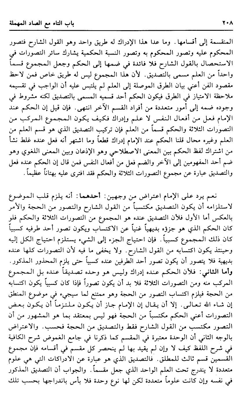 نعم يرد على الإِمَام اعْتِرَاض من وَجْهَيْن: أَحدهمَا: أَنه يلْزم قلب الْمَوْضُوع لاستلزامه أَن يكون التَّصْدِيق مكتسبا من القَوْل الشَّارِح والتصور من الْحجَّة وَالْأَمر بِالْعَكْسِ أما الأول فَلِأَن التَّصْدِيق عِنْده هُوَ الْمَجْمُوع من التصورات الثَّلَاثَة وَالْحكم فَلَو كَانَ الحكم الَّذِي هُوَ جزؤه بديهيا غَنِيا عَن الِاكْتِسَاب وَيكون تصور أحد طَرفَيْهِ كسبيا كَانَ ذَلِك الْمَجْمُوع كسبيا. فَإِن احْتِيَاج الْجُزْء إِلَى الشَّيْء يسْتَلْزم احْتِيَاج الْكل إِلَيْهِ وَحِينَئِذٍ يكون اكتسابه من القَوْل الشَّارِح. وَلَا يخفى مَا فِيهِ لِأَن التصورات كلهَا عِنْده بديهية فَلَا يتَصَوَّر أَن يكون تصور أحد الطَّرفَيْنِ عِنْده كسبيا حَتَّى يلْزم الْمَحْذُور الْمَذْكُور. وَأما الثَّانِي: فَلِأَن الحكم عِنْده إِدْرَاك وَلَيْسَ هُوَ وَحده تَصْدِيقًا عِنْده بل الْمَجْمُوع الْمركب مِنْهُ وَمن التصورات الثَّلَاثَة فَلَا بُد أَن يكون تصورا فَإِذا كَانَ كسبيان يكون اكتسابه من الْحجَّة فَيلْزم اكْتِسَاب التَّصَوُّر من الْحجَّة وَهُوَ مُمْتَنع لما سَيَجِيءُ فِي مَوْضُوع الْمنطق إِن شَاءَ الله تَعَالَى. إِلَّا أَن يُقَال إِن الإِمَام جَازَ أَن يكون مُلْتَزما أَن يكون بعض التصورات أَعنِي الحكم مكتسبا من الْحجَّة فَهُوَ لَيْسَ بمعتقد بِمَا هُوَ الْمَشْهُور من أَن التَّصَوُّر مكتسب من القَوْل الشَّارِح فَقَط والتصديق من الْحجَّة فَحسب. والاعتراض بِالْوَجْهِ الثَّانِي أَن الْوحدَة مُعْتَبرَة فِي الْمقسم كَمَا ذكرنَا فِي جَامع الغموض شرح الكافية فِي شرح اللَّفْظ كَيفَ لَا وَإِن لم يُقيد بهَا لم ينْحَصر كل مقسم فِي أقسامه فَإِن مَجْمُوع الْقسمَيْنِ قسم ثَالِث للمطلق. فالتصديق الَّذِي هُوَ عبارَة عَن الادراكات الَّتِي هِيَ عُلُوم مُتعَدِّدَة لَا ينْدَرج تَحت الْعلم الْوَاحِد الَّذِي جعل مقسمًا. وَالْجَوَاب أَن التَّصْدِيق الْمَذْكُور فِي نَفسه وَإِن كَانَت علوما مُتعَدِّدَة لَكِن لَهَا نوع وحدة فَلَا بَأْس باندراجها بِحَسب تِلْكَ
