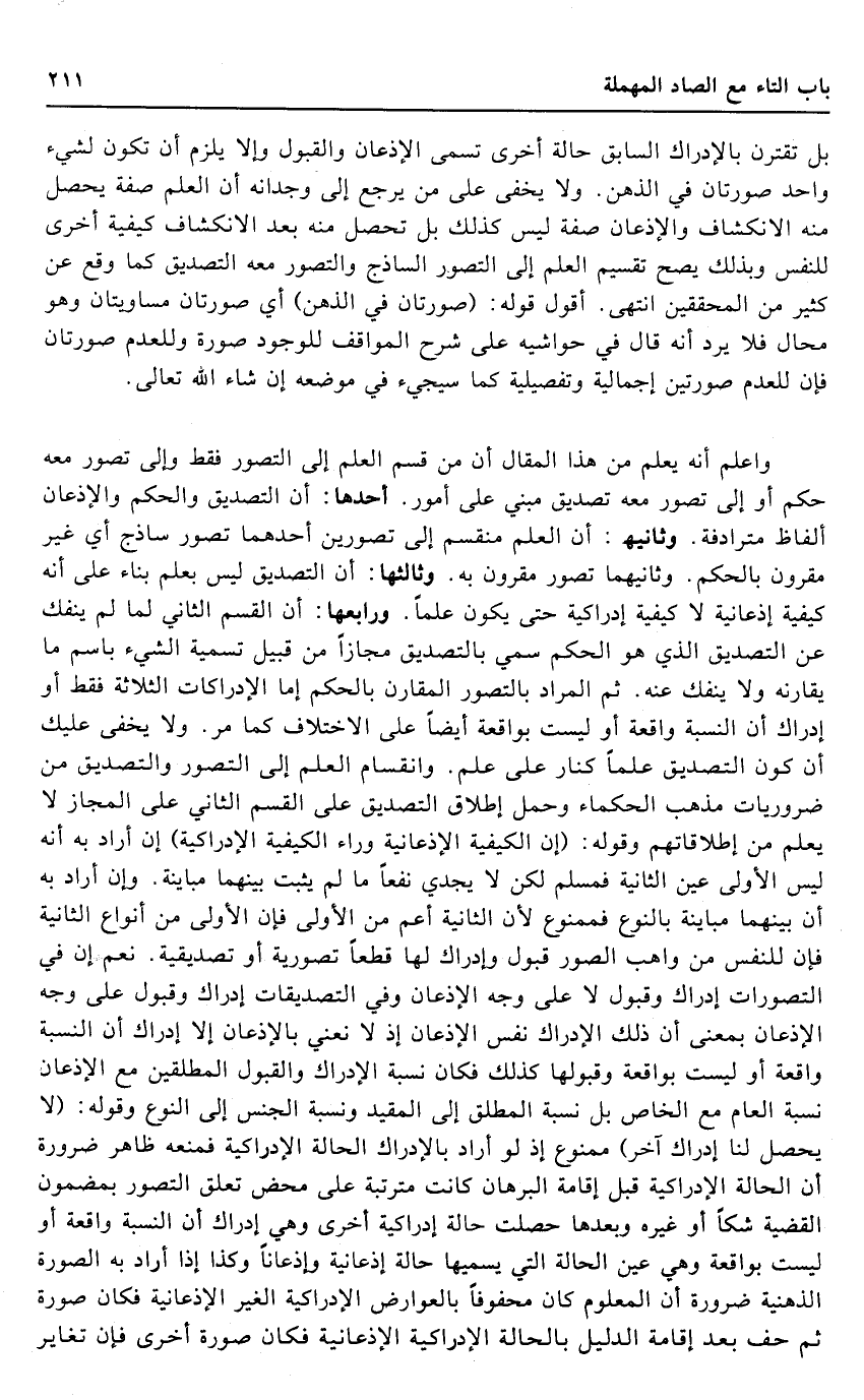 بل تقترن بالإدراك السَّابِق حَالَة أُخْرَى تسمى الإذعان وَالْقَبُول وَإِلَّا يلْزم أَن تكون لشَيْء وَاحِد صُورَتَانِ فِي الذِّهْن. وَلَا يخفى على من يرجع إِلَى وجدانه أَن الْعلم صفة يحصل مِنْهُ الانكشاف والإذعان صفة لَيْسَ كَذَلِك بل تحصل مِنْهُ بعد الانكشاف كَيْفيَّة أُخْرَى للنَّفس وَبِذَلِك يَصح تَقْسِيم الْعلم إِلَى التَّصَوُّر الساذج والتصور مَعَه التَّصْدِيق كَمَا وَقع عَن كثير من الْمُحَقِّقين انْتهى. أَقُول قَوْله: (صُورَتَانِ فِي الذِّهْن) أَي صُورَتَانِ مساويتان وَهُوَ محَال فَلَا يرد أَنه قَالَ فِي حَوَاشِيه على شرح المواقف للوجود صُورَة وللعدم صُورَتَانِ فَإِن للعدم صُورَتَيْنِ إجمالية وتفصيله كَمَا سَيَجِيءُ فِي مَوْضِعه إِن شَاءَ الله تَعَالَى.