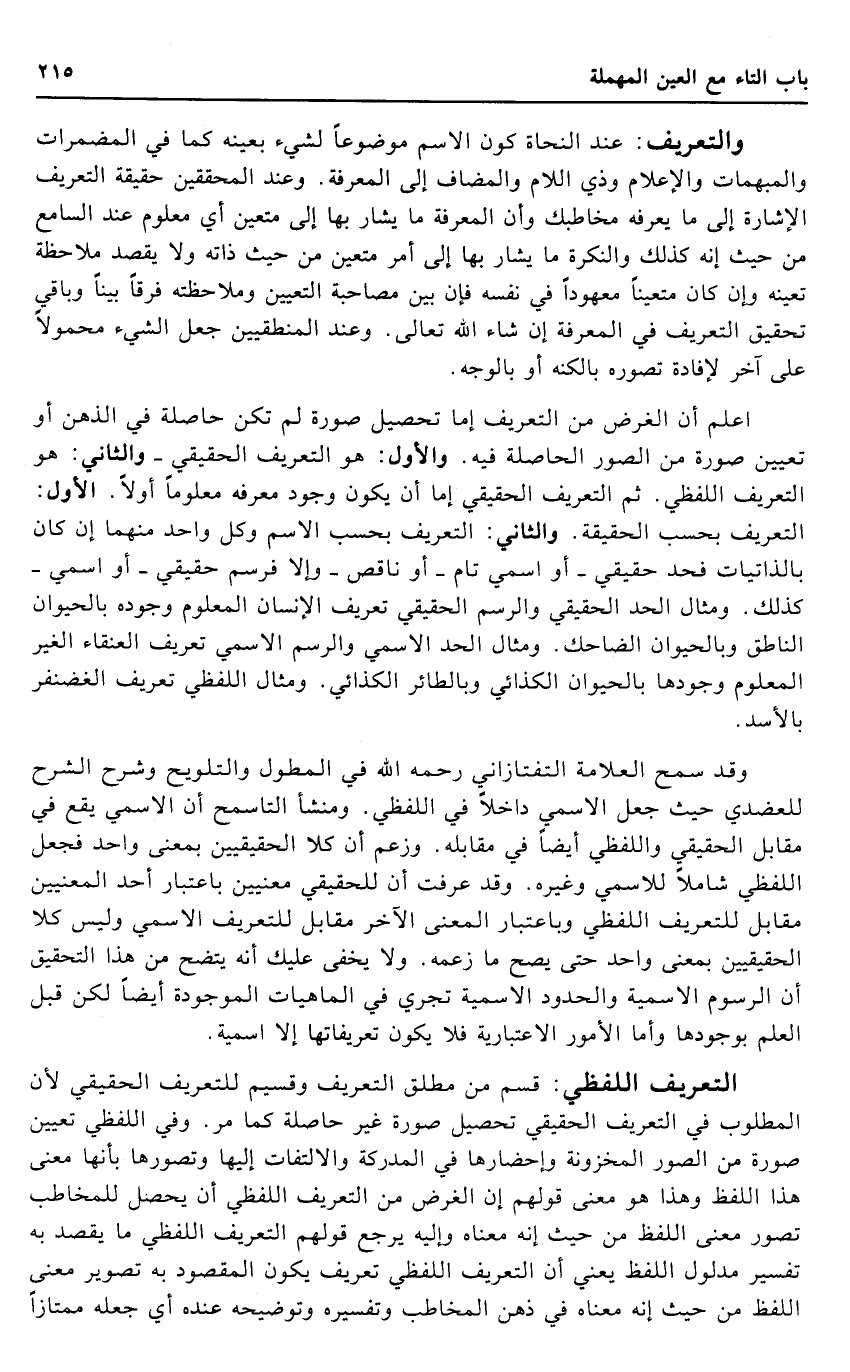 اعْلَم أَن الْغَرَض من التَّعْرِيف إِمَّا تَحْصِيل صُورَة لم تكن حَاصِلَة فِي الذِّهْن أَو تعْيين صُورَة من الصُّور الْحَاصِلَة فِيهِ. وَالْأول: هُوَ التَّعْرِيف الْحَقِيقِيّ - وَالثَّانِي: هُوَ التَّعْرِيف اللَّفْظِيّ. ثمَّ التَّعْرِيف الْحَقِيقِيّ إِمَّا أَن يكون وجود معرفه مَعْلُوما أَولا. الأول: التَّعْرِيف بِحَسب الْحَقِيقَة. وَالثَّانِي: التَّعْرِيف بِحَسب الِاسْم وكل وَاحِد مِنْهُمَا إِن كَانَ بالذاتيات فحد حَقِيقِيّ - أَو اسْمِي تَامّ - أَو نَاقص - وَإِلَّا فرسم حَقِيقِيّ - أَو اسْمِي - كَذَلِك. وَمِثَال الْحَد الْحَقِيقِيّ والرسم الْحَقِيقِيّ تَعْرِيف الْإِنْسَان الْمَعْلُوم وجوده بِالْحَيَوَانِ النَّاطِق وبالحيوان الضاحك. وَمِثَال الْحَد الاسمي والرسم الاسمي تَعْرِيف العنقاء الْغَيْر الْمَعْلُوم وجودهَا بِالْحَيَوَانِ الكذائي وبالطائر الكذائي. وَمِثَال اللَّفْظِيّ تَعْرِيف الغضنفر بالأسد.