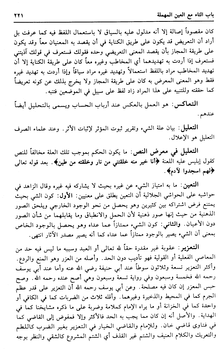 التَّعْلِيل: بَيَان عِلّة الشَّيْء وَتَقْرِير ثُبُوت الْمُؤثر لإِثْبَات الْأَثر. وَعند عُلَمَاء الصّرْف التَّعْلِيل هُوَ الإعلال.